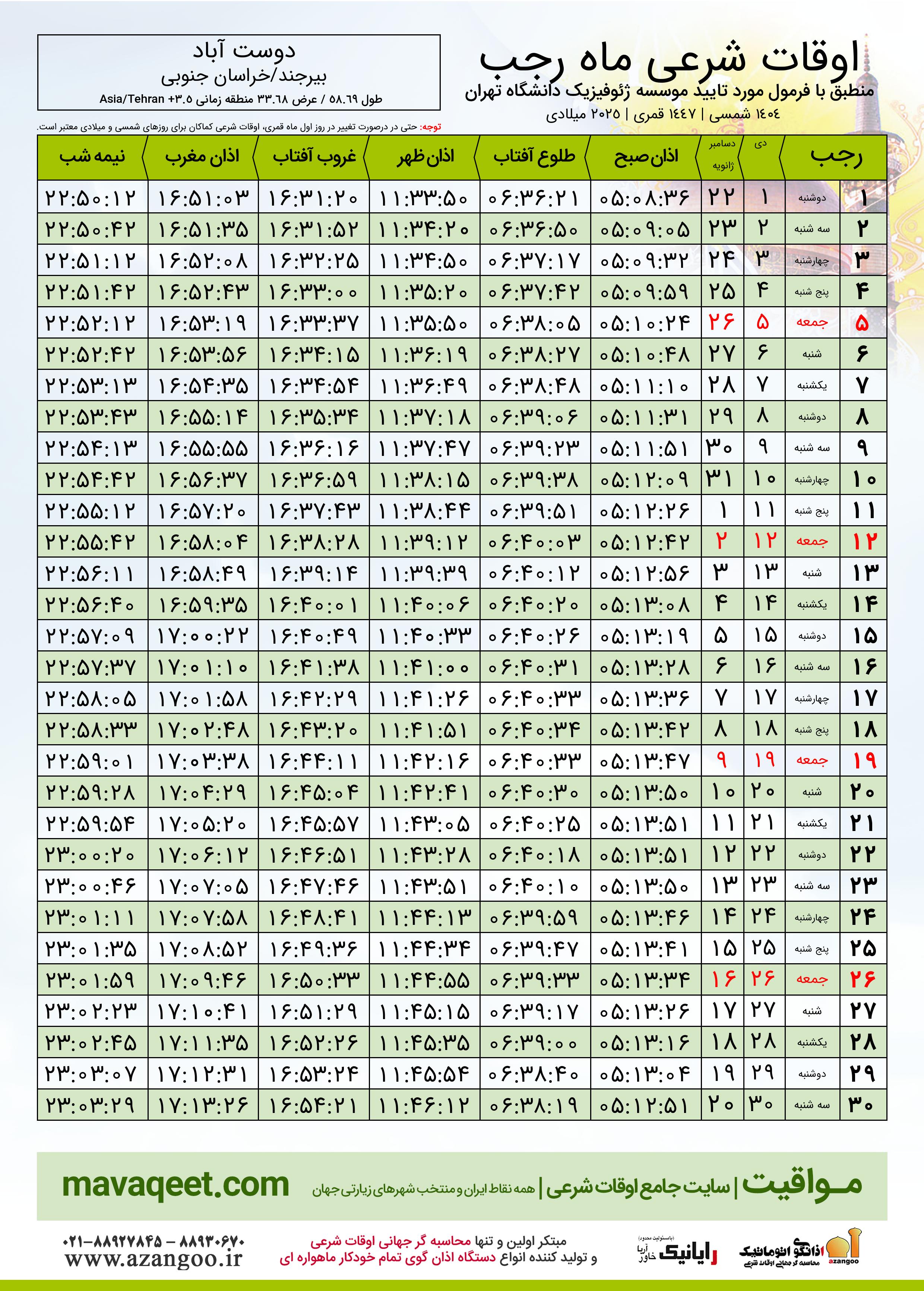اوقات شرعی رجب ١٤٤٧ قمری شهر دوست آباد
