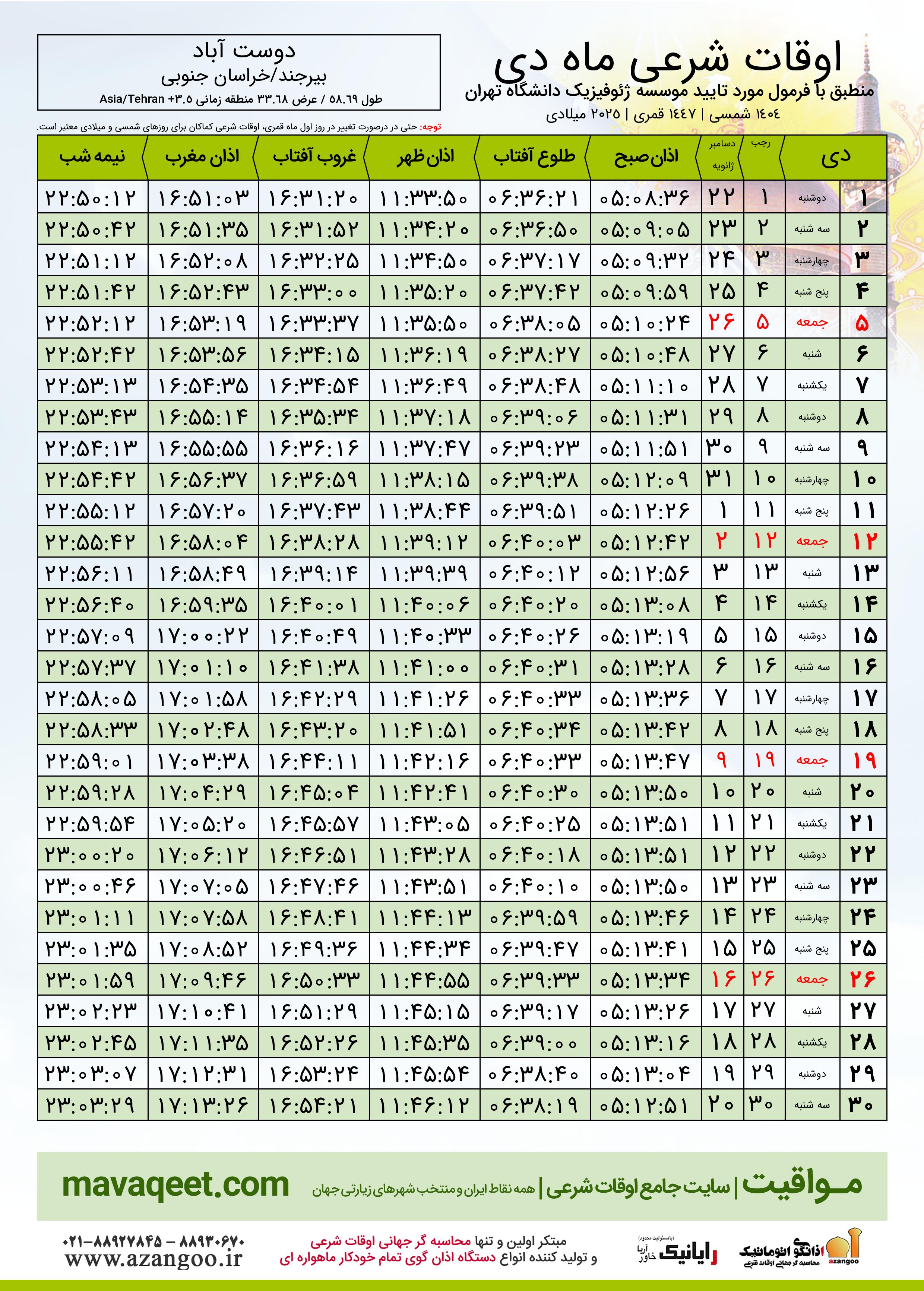 اوقات شرعی دی ١٤٠٤ شمسی شهر دوست آباد