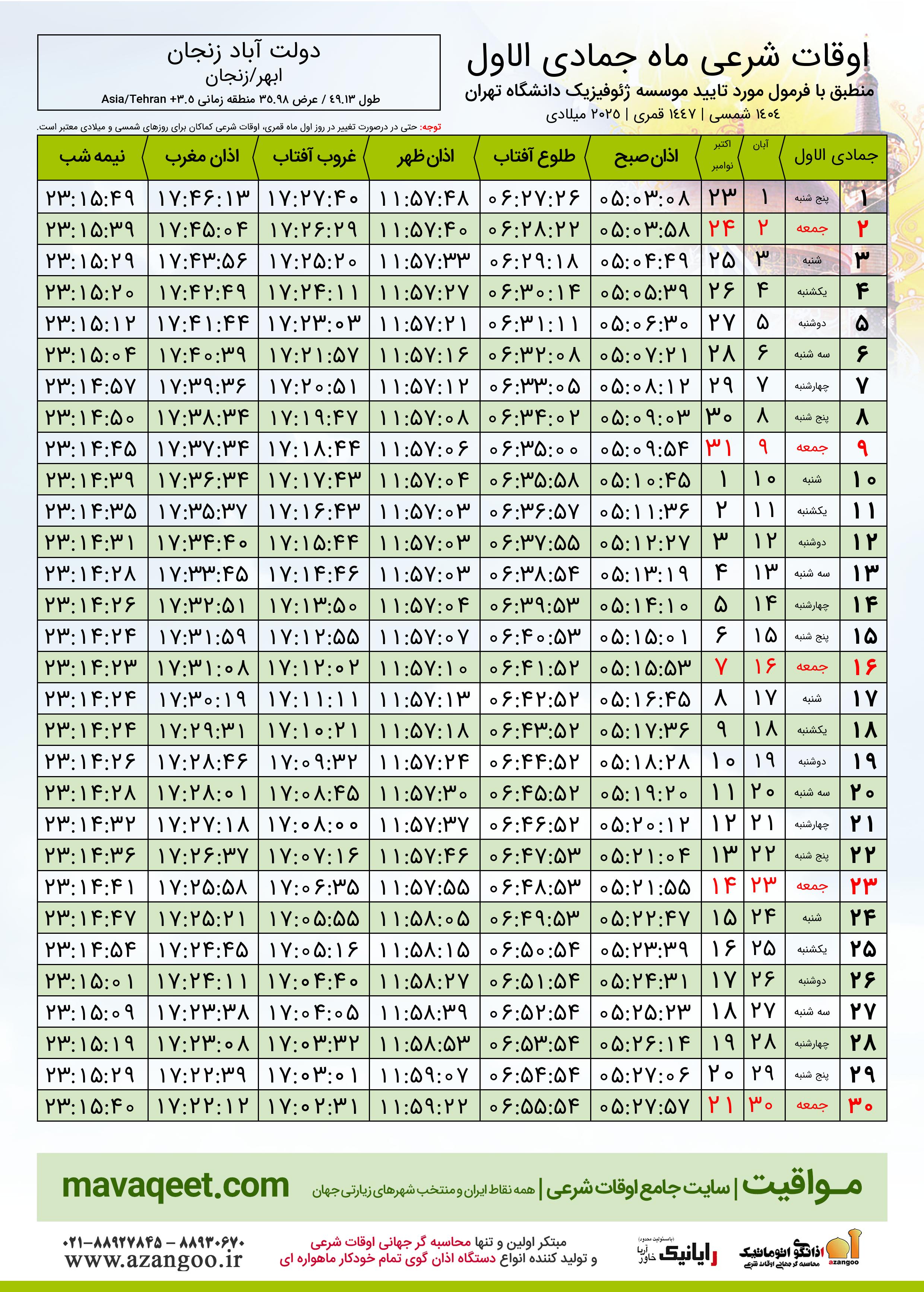 اوقات شرعی ماه جمادی الاول ١٤٤٧ هـ.ق شهر دولت آباد زنجان بر
