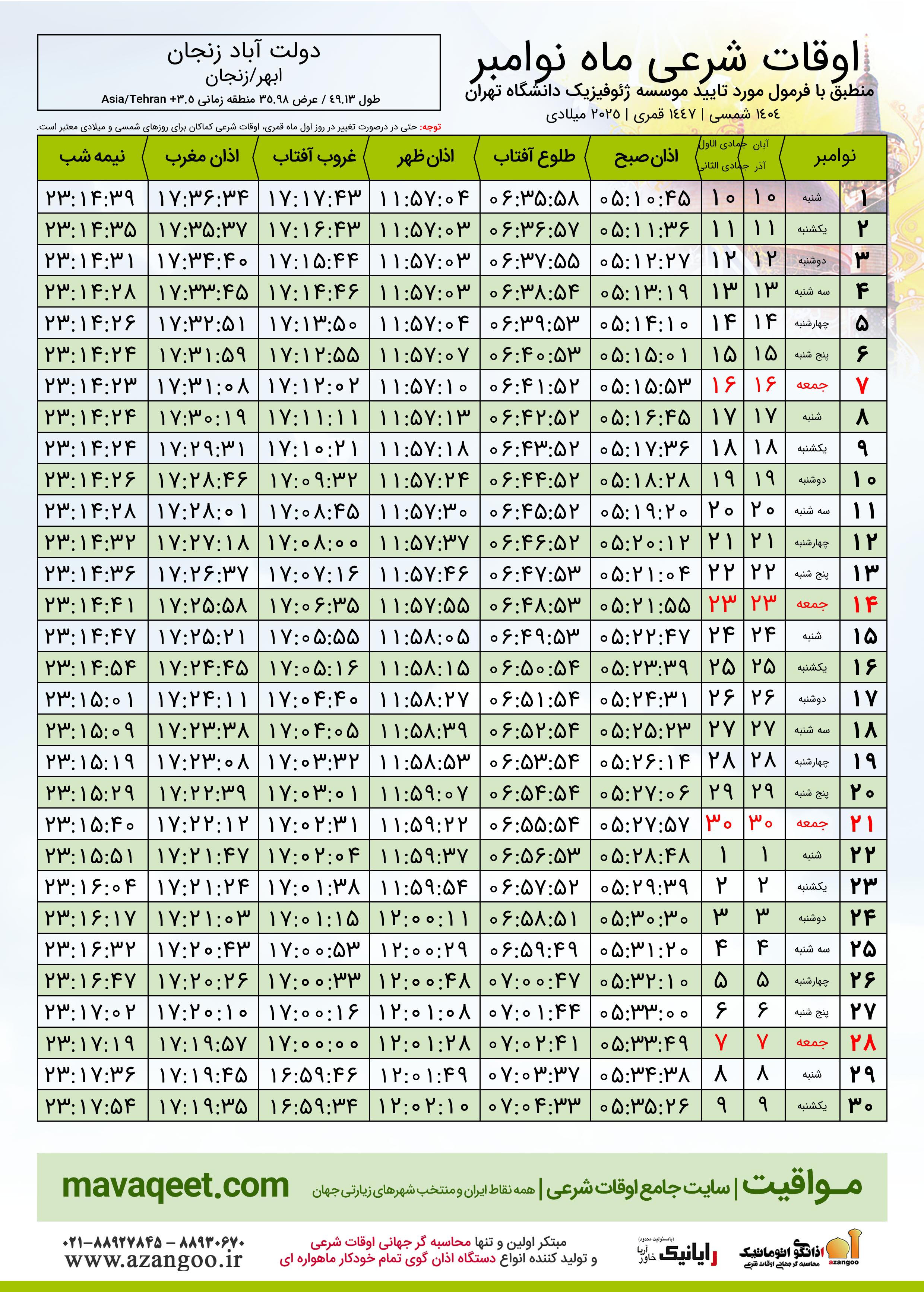 جدول اوقات شرعی آبان ١٤٠٤ شمسی شهر دولت آباد زنجان