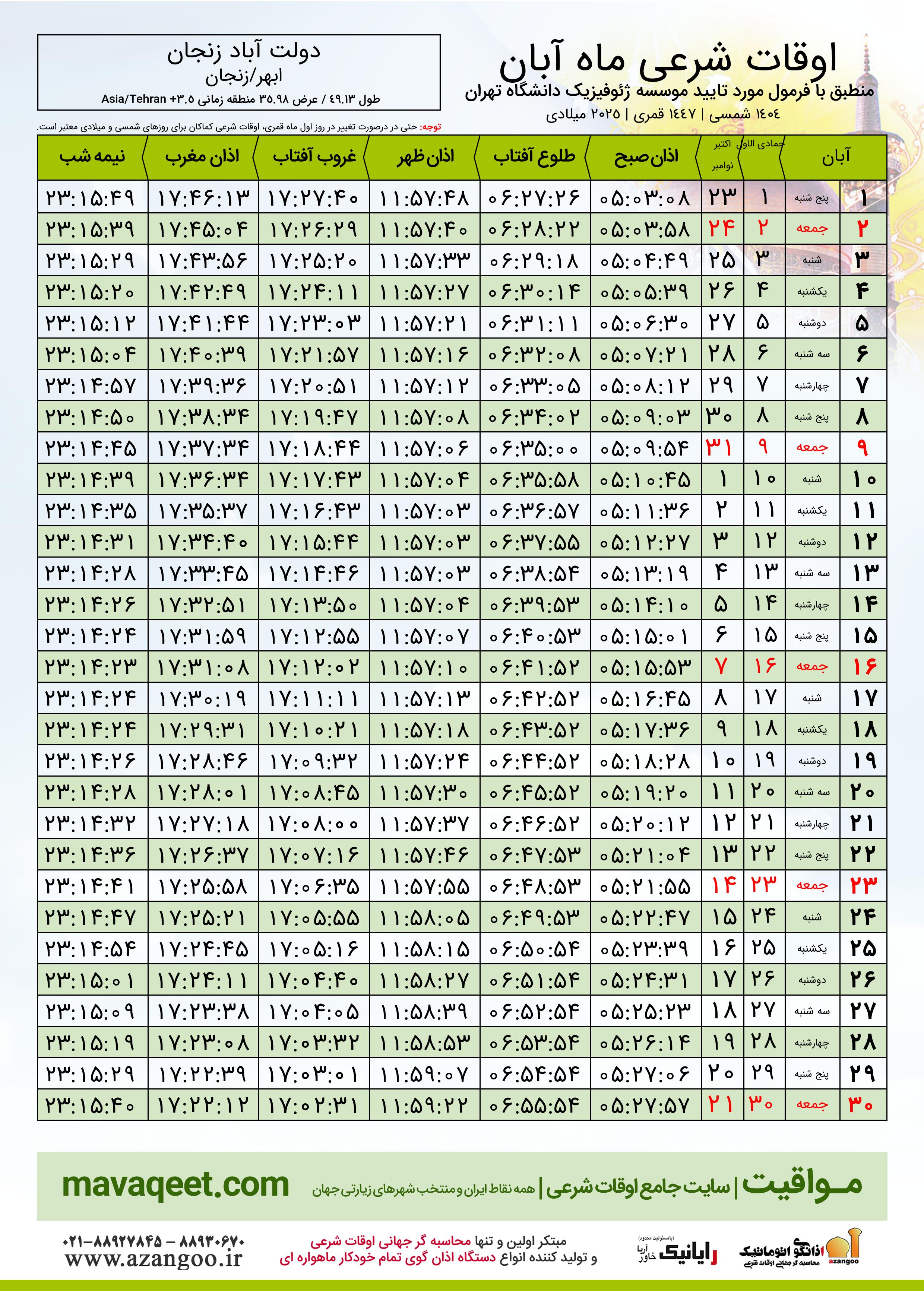 اوقات شرعی آبان ١٤٠٤ شمسی شهر دولت آباد زنجان