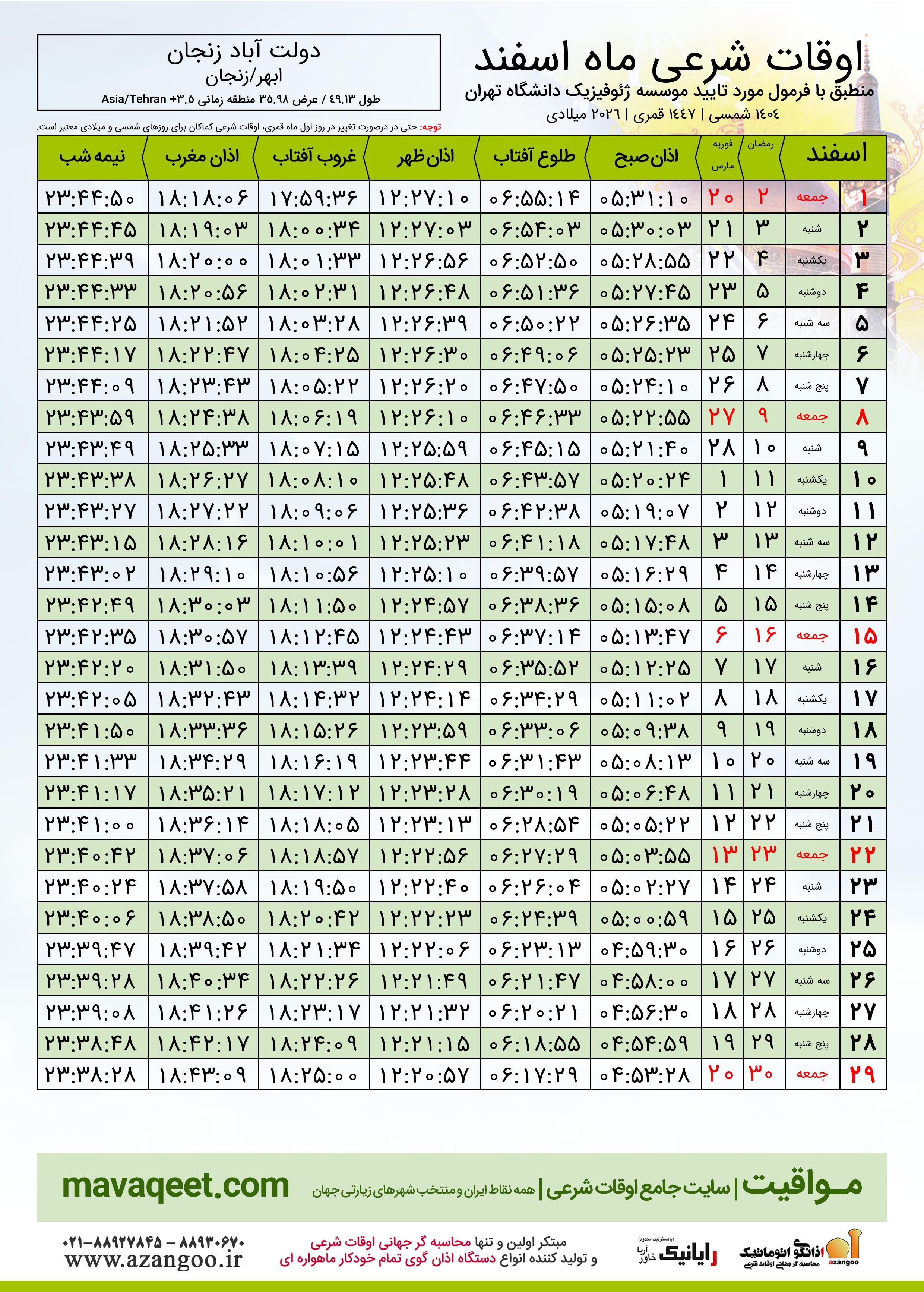 اوقات شرعی اسفند ١٤٠٤ شمسی شهر دولت آباد زنجان