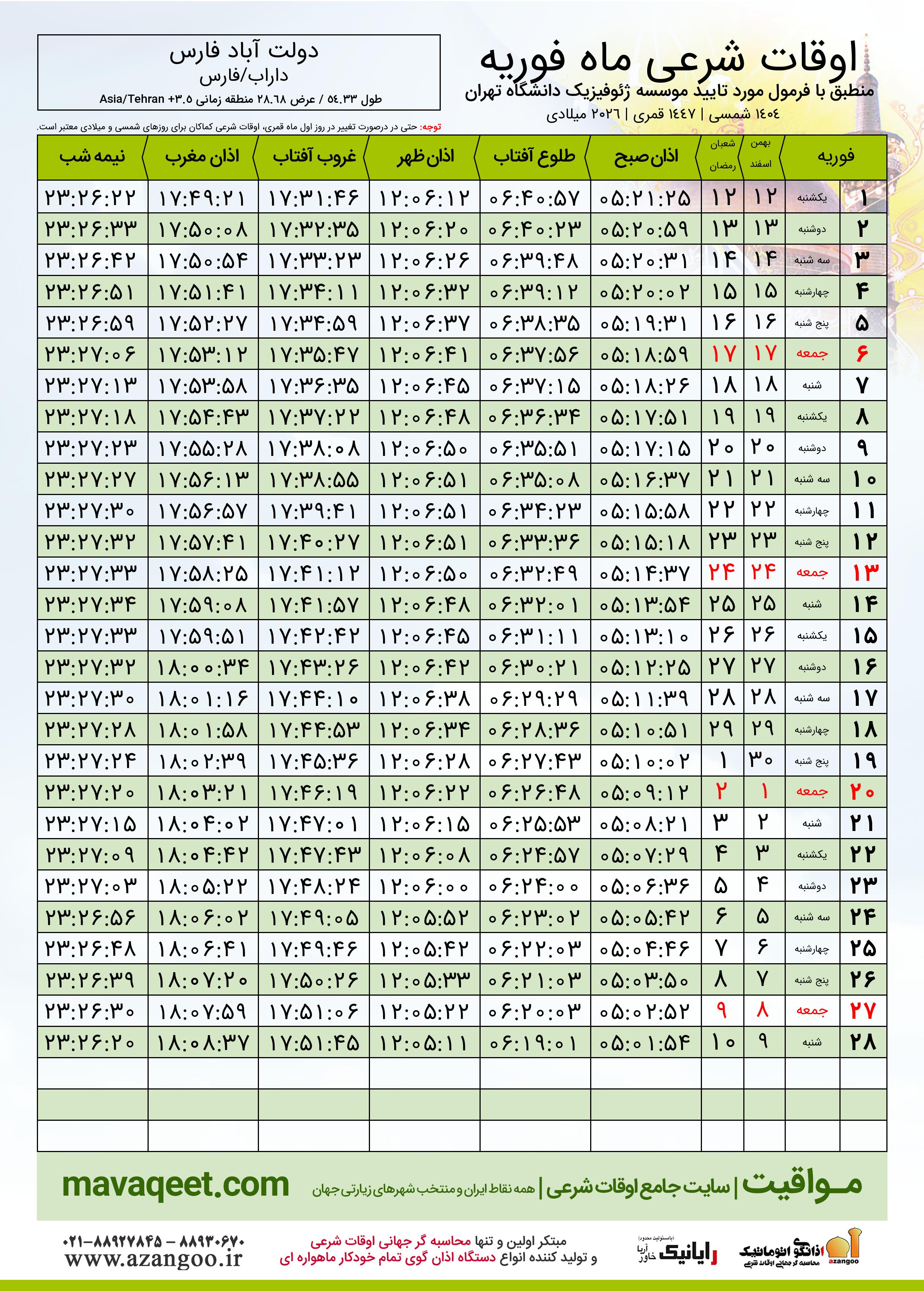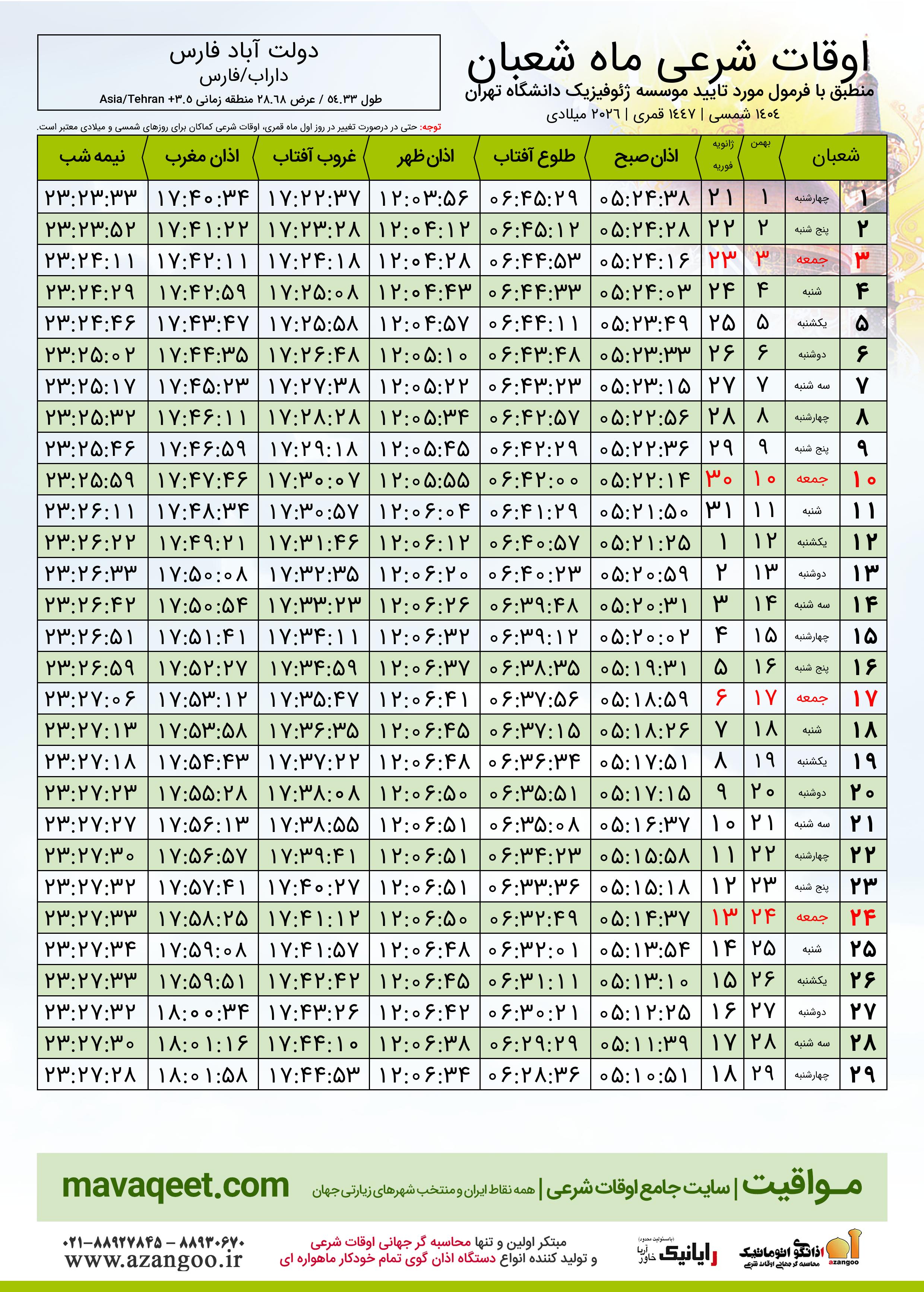 اوقات شرعی ماه شعبان ١٤٤٧ هـ.ق شهر دولت آباد فارس بر