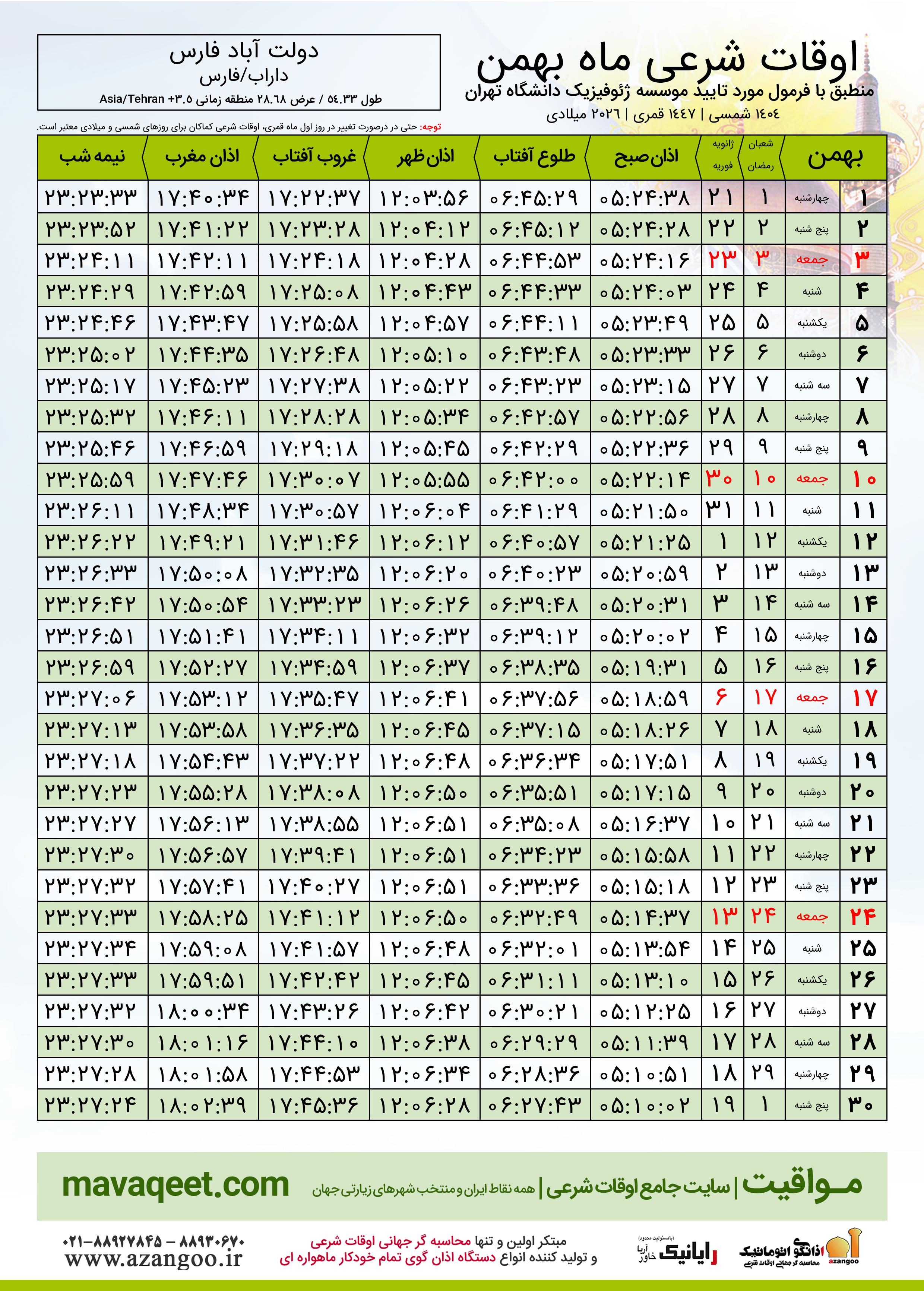 دانلود اوقات شرعی بهمن ٠٤ - ١٤٠٤ شهر دولت آباد فارس