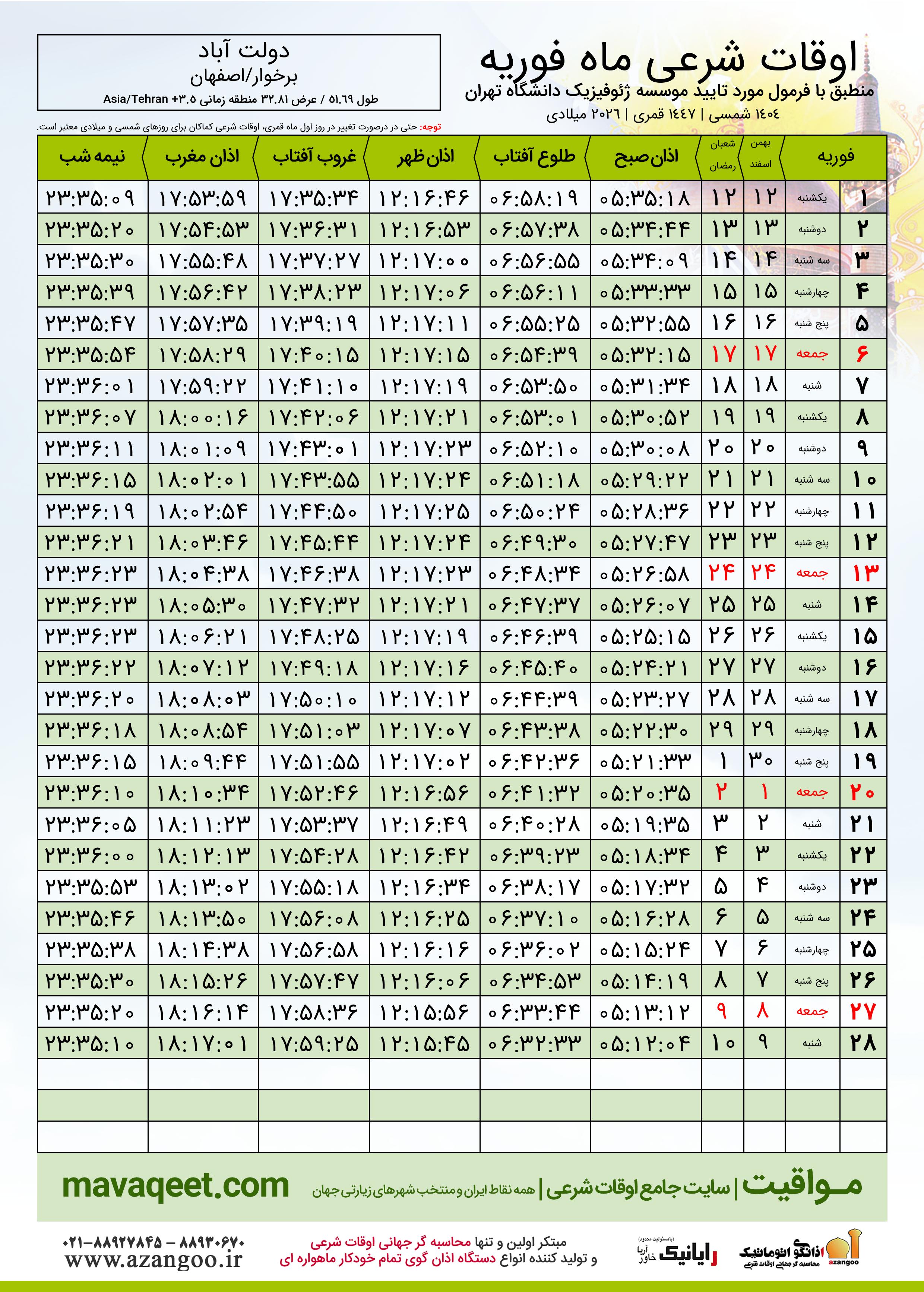 اوقات شرعی ماه شعبان ١٤٤٧ هـ.ق شهر دولت آباد بر