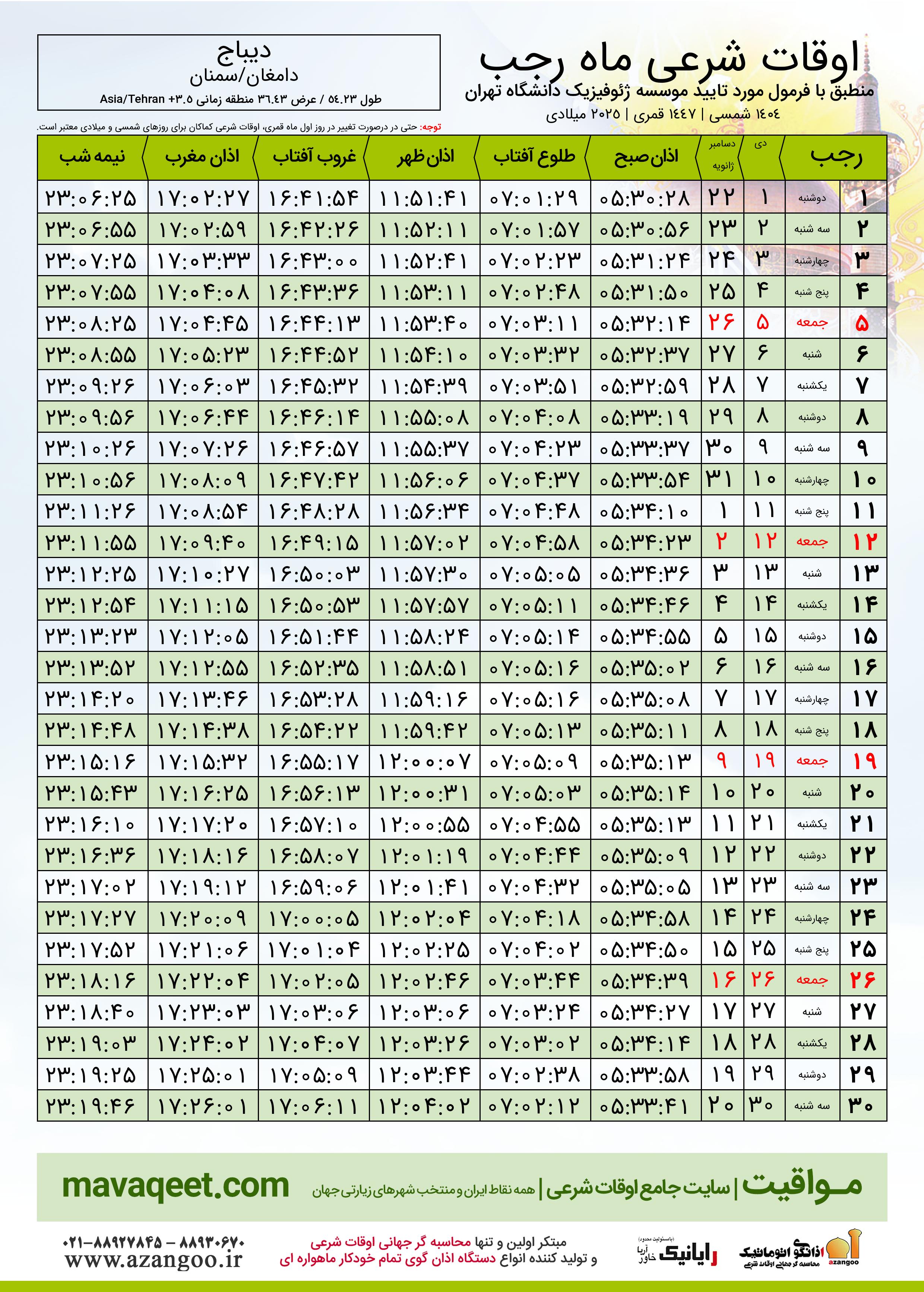 اوقات شرعی ماه رجب ١٤٤٧ هـ.ق شهر دیباج بر