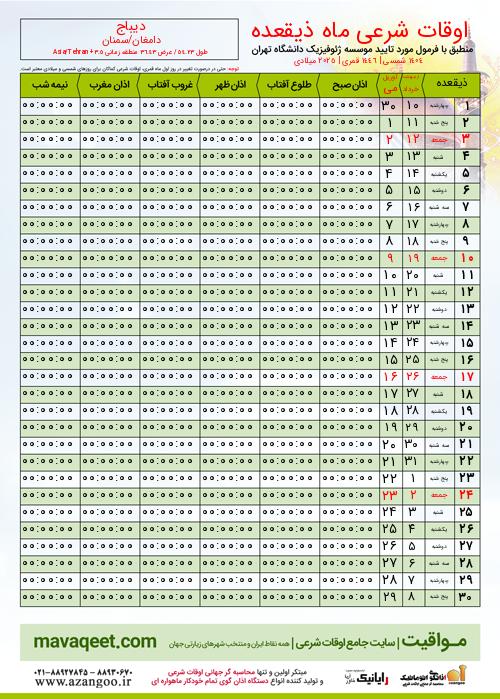 اوقات شرعی دی ١٤٠٤ شمسی شهر دیباج