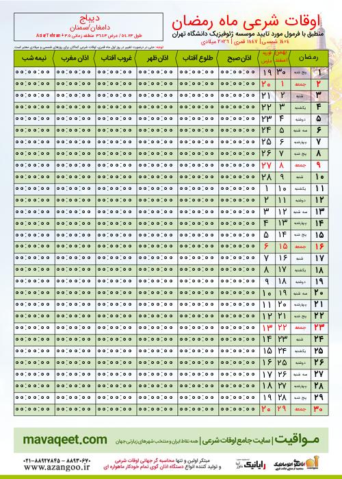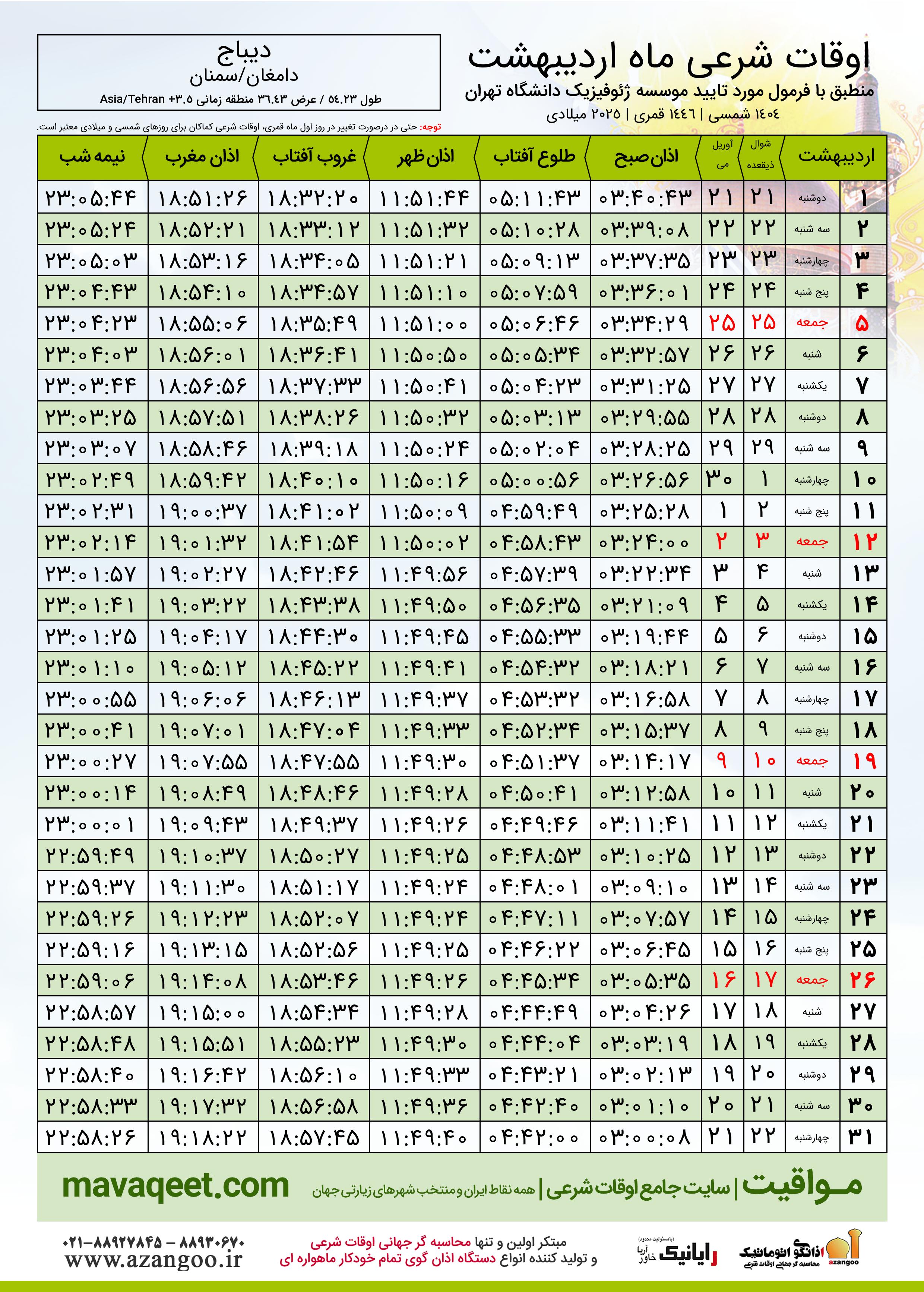 دانلود اوقات شرعی ماه رمضان ٠٤ - ١٤٠٤ شمسی | ٢٠٢٦ میلادی | ١٤٤٧ قمری شهر دیباج