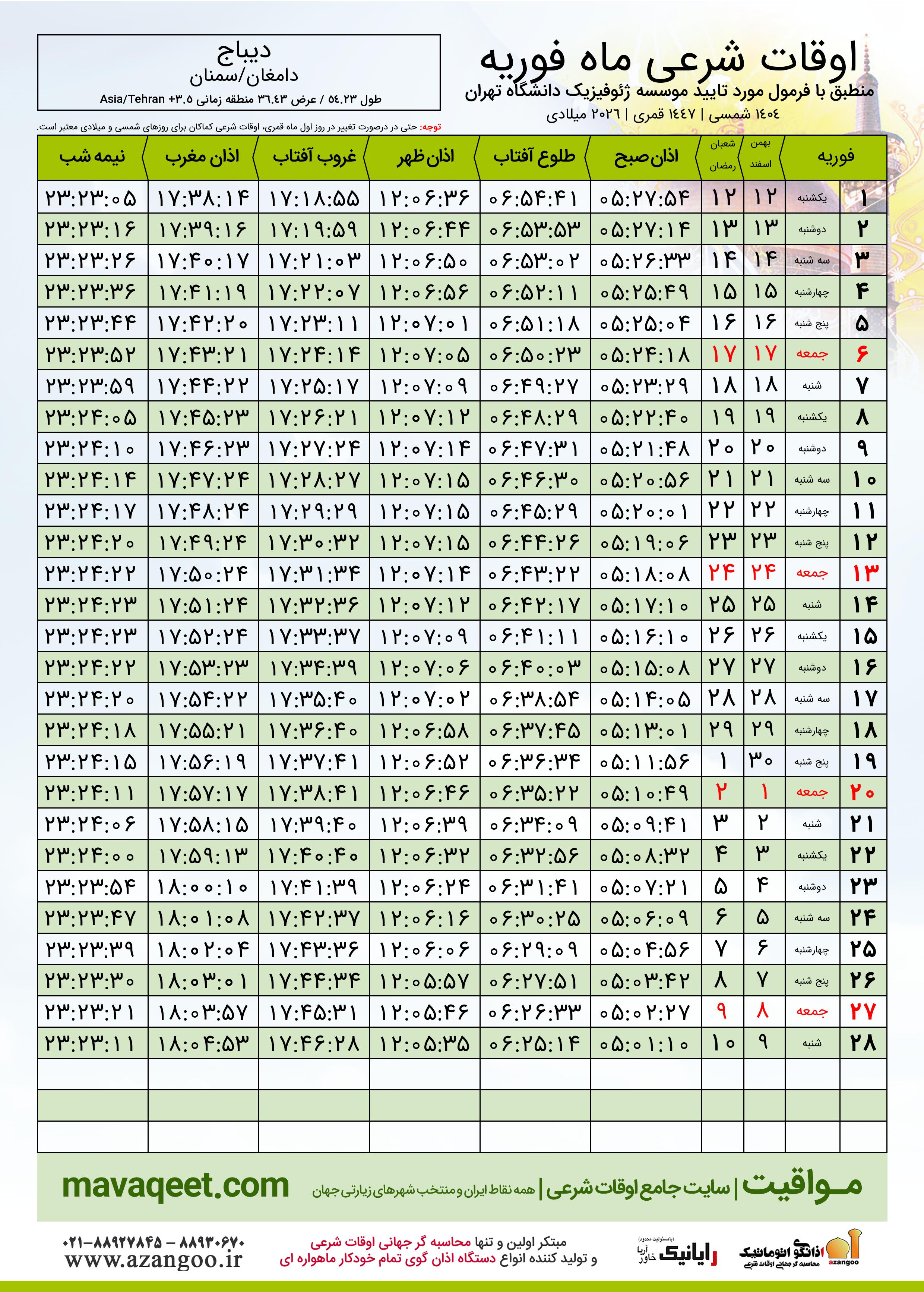 دانلود اوقات شرعی فوریه ٢٠٢٦ شهر دیباج