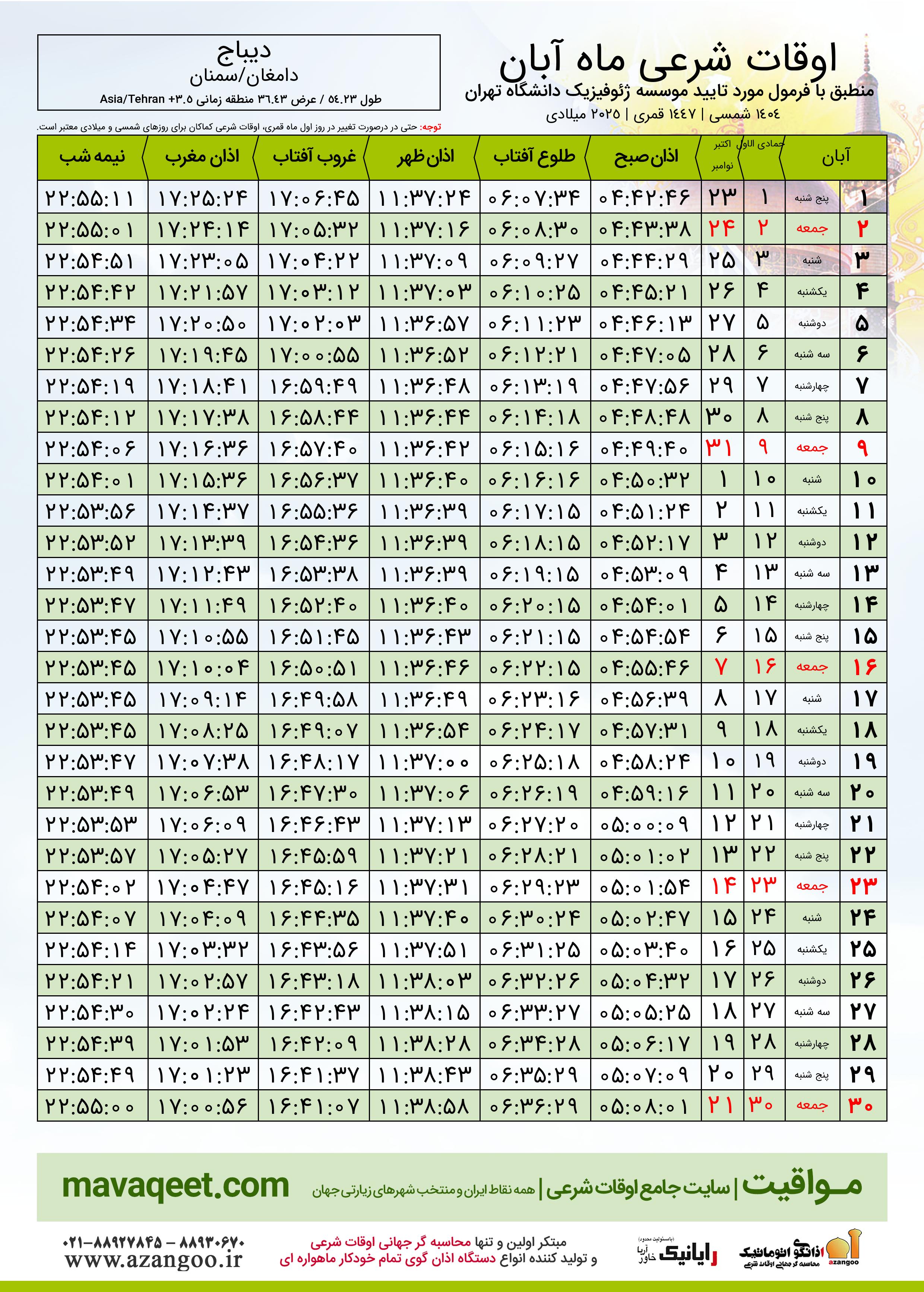جدول اوقات شرعی آبان ١٤٠٤ شمسی شهر دیباج