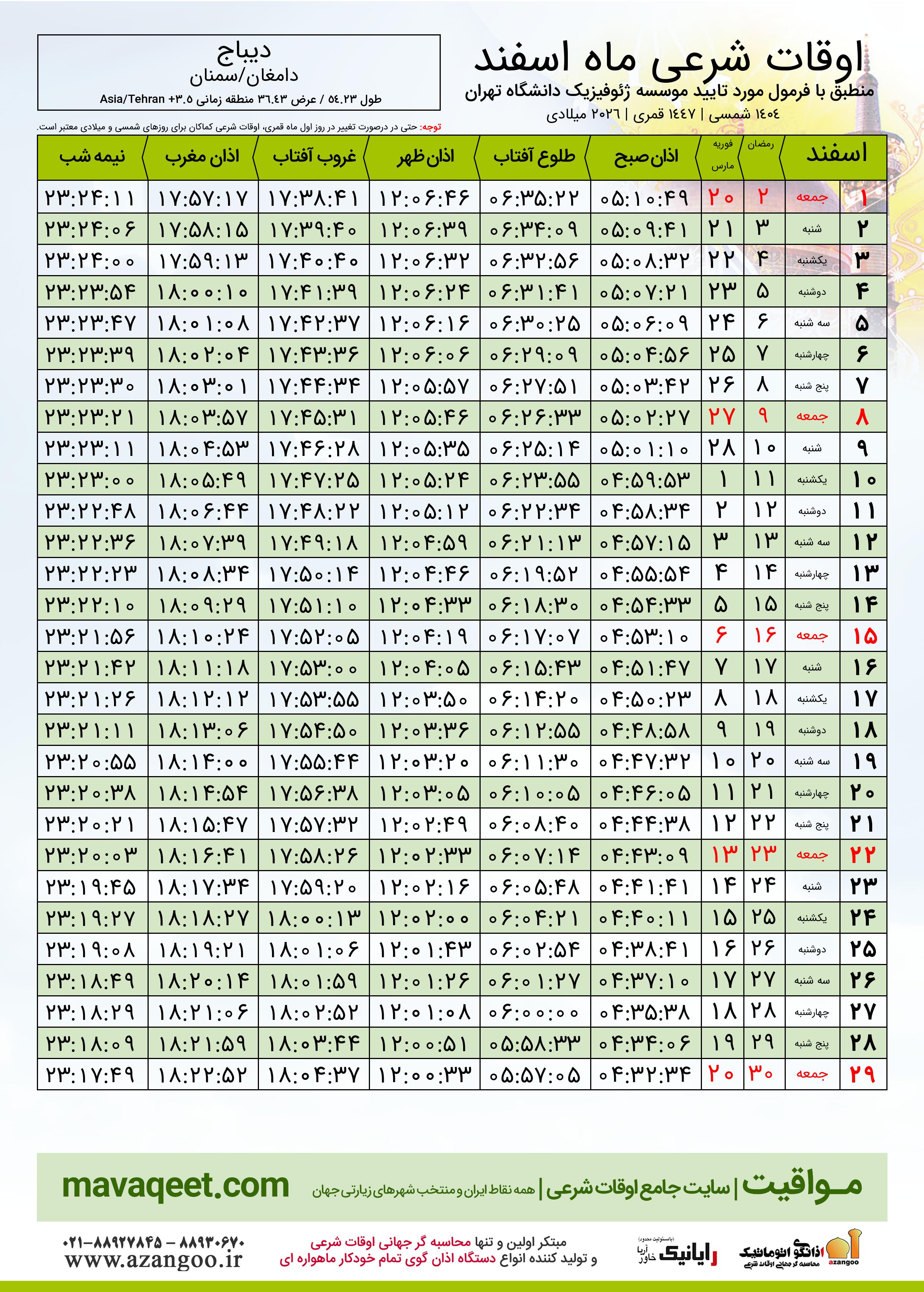 جدول اوقات شرعی رمضان ١٤٤٧ قمری شهر دیباج