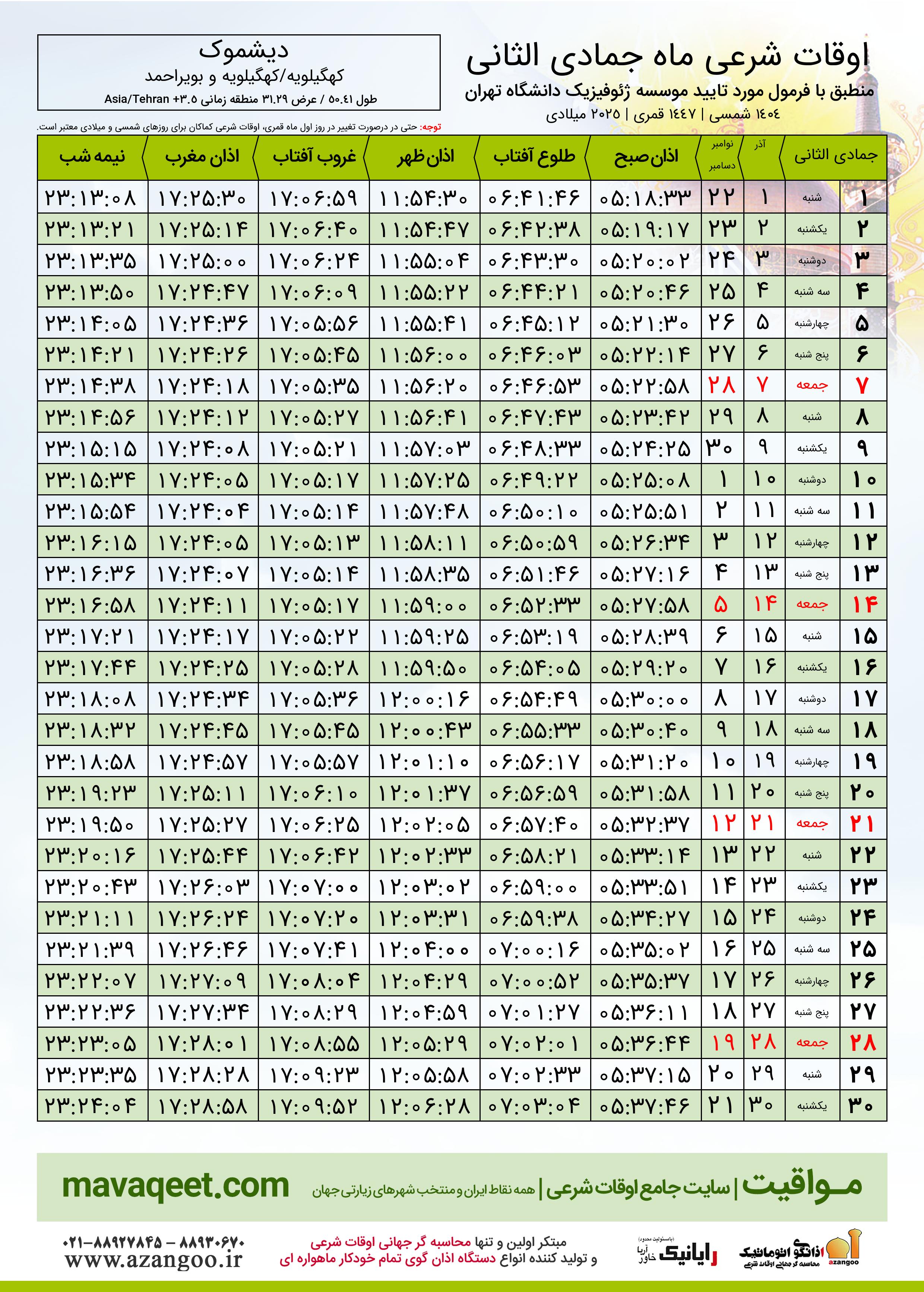 اوقات شرعی ماه جمادی الثانی ١٤٤٧ هـ.ق شهر دیشموک بر