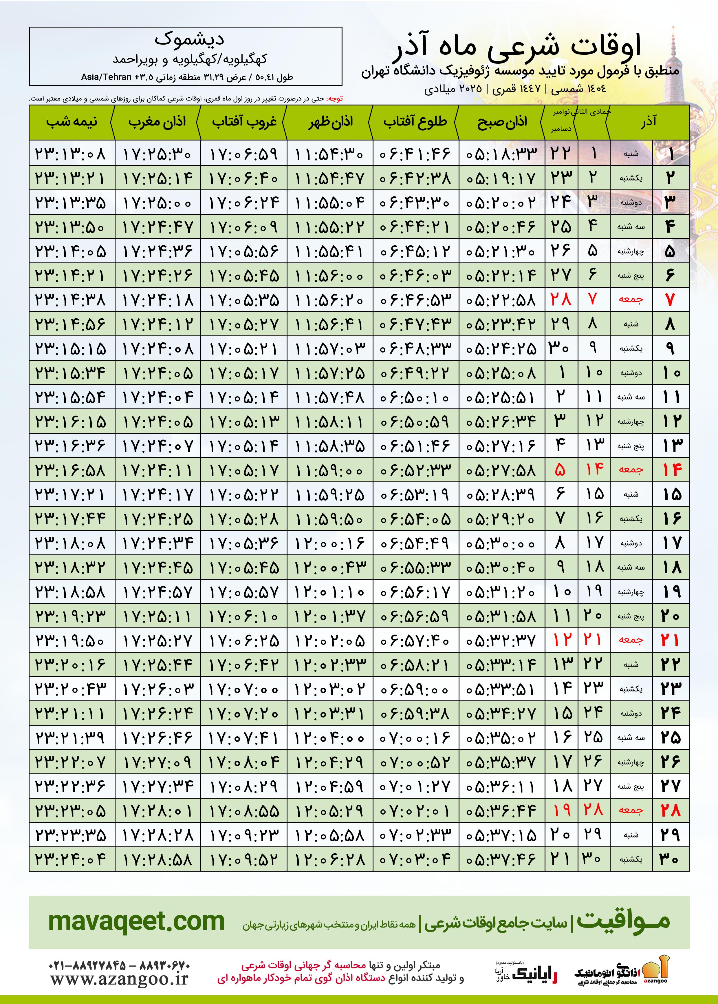 اوقات شرعی آذر ١٤٠٤ شمسی شهر دیشموک
