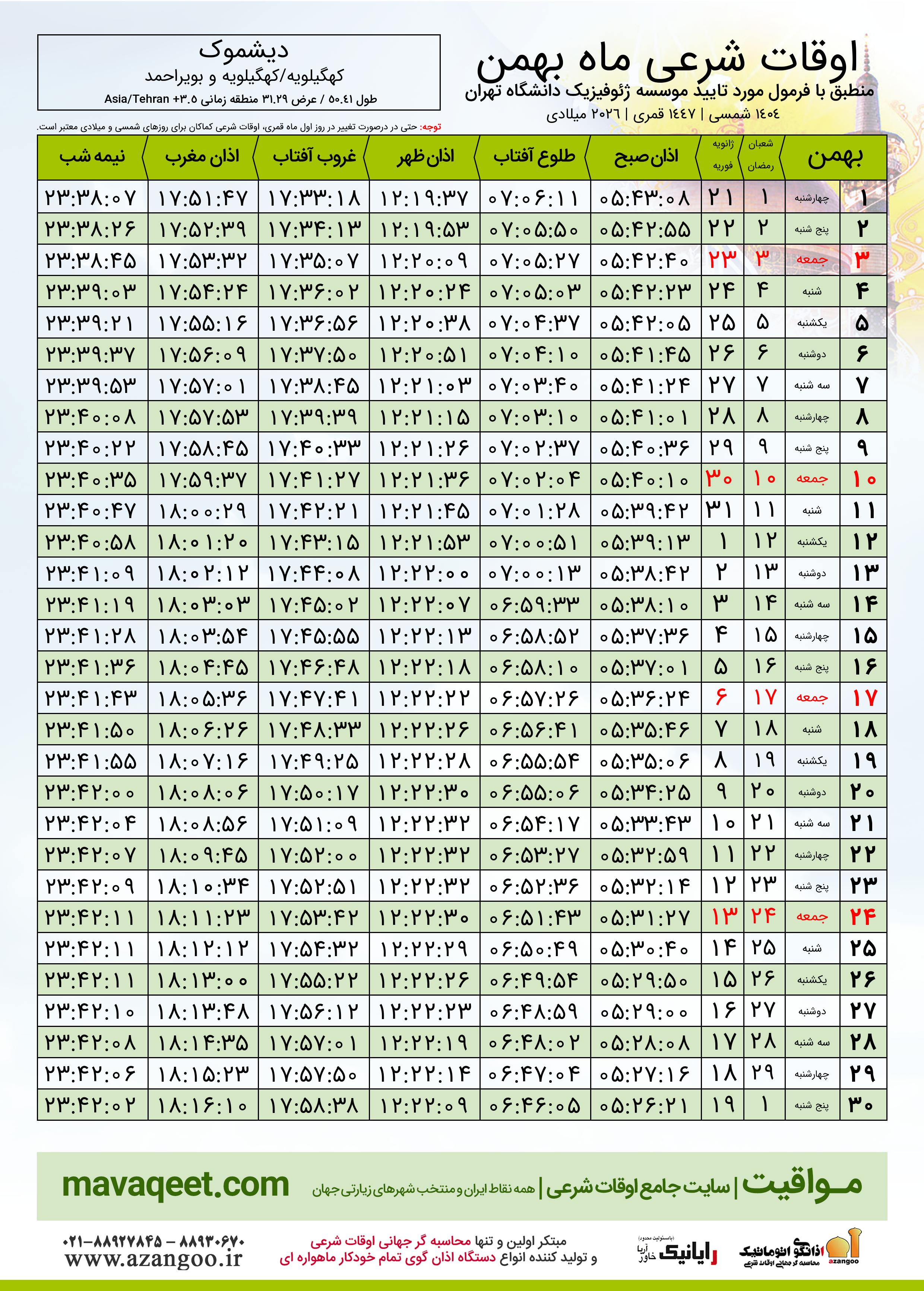 اوقات شرعی بهمن ١٤٠٤ شمسی شهر دیشموک