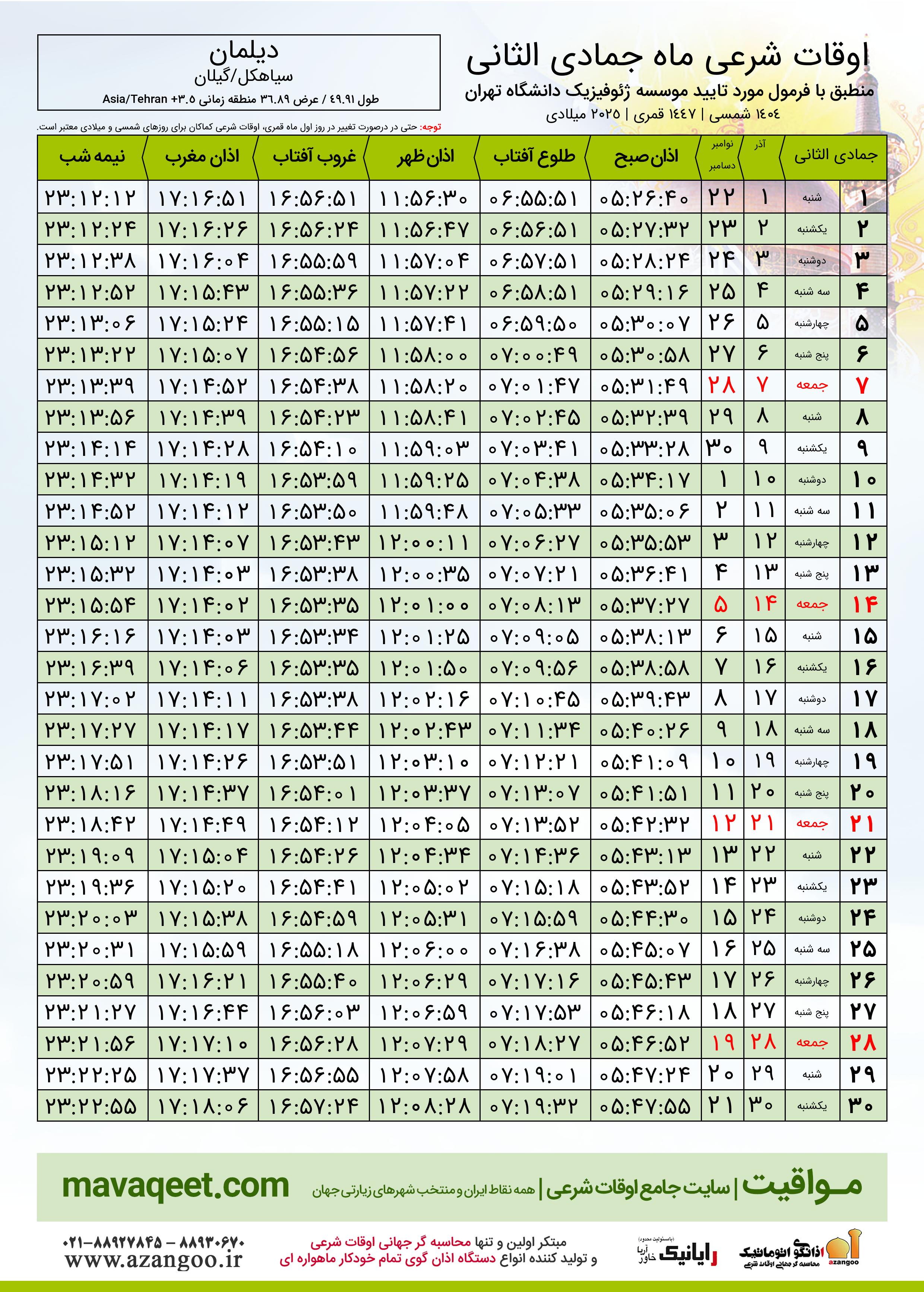 اوقات شرعی ماه جمادی الثانی ١٤٤٧ هـ.ق شهر دیلمان بر