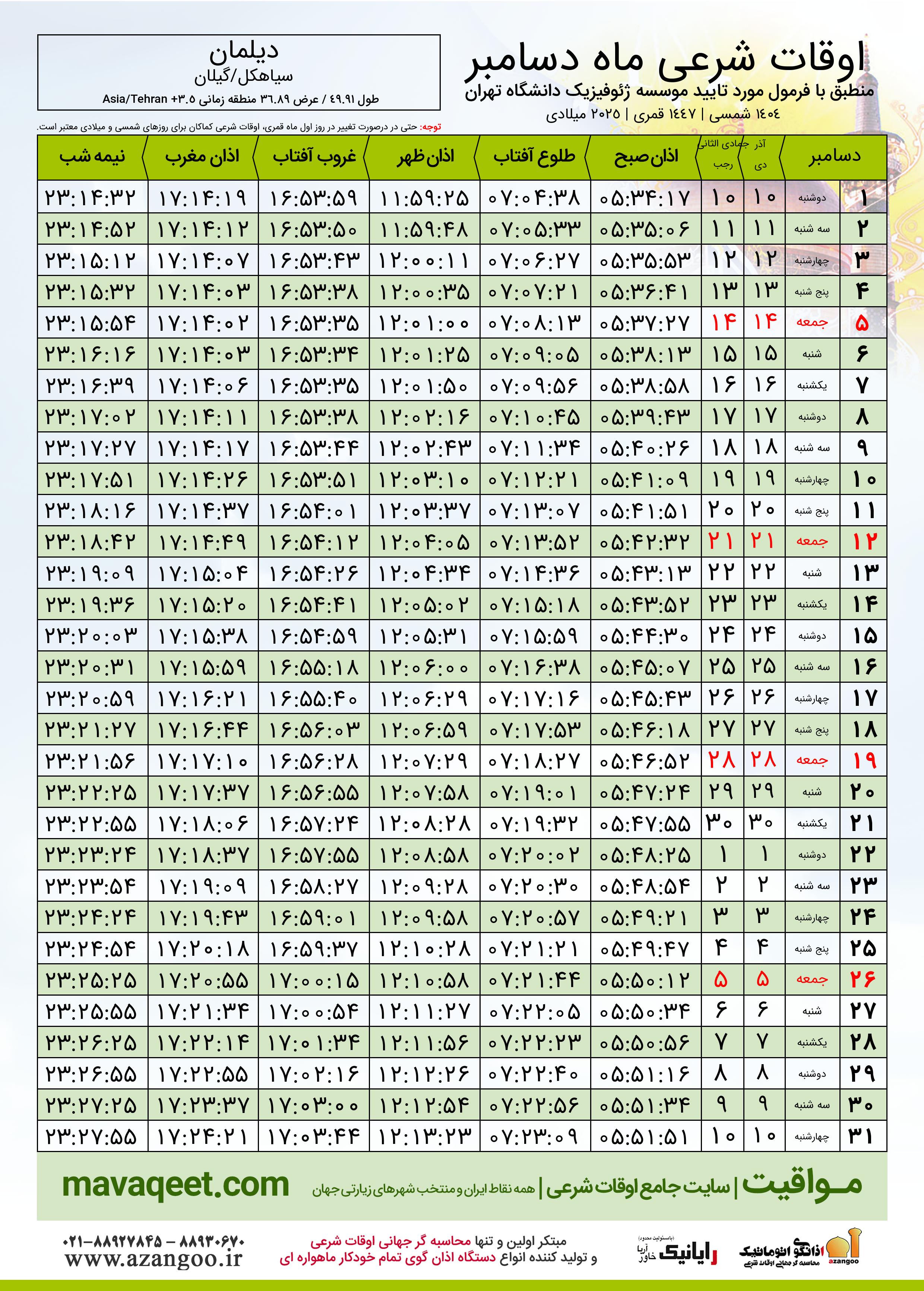 جدول اوقات شرعی آذر ١٤٠٤ شمسی شهر دیلمان