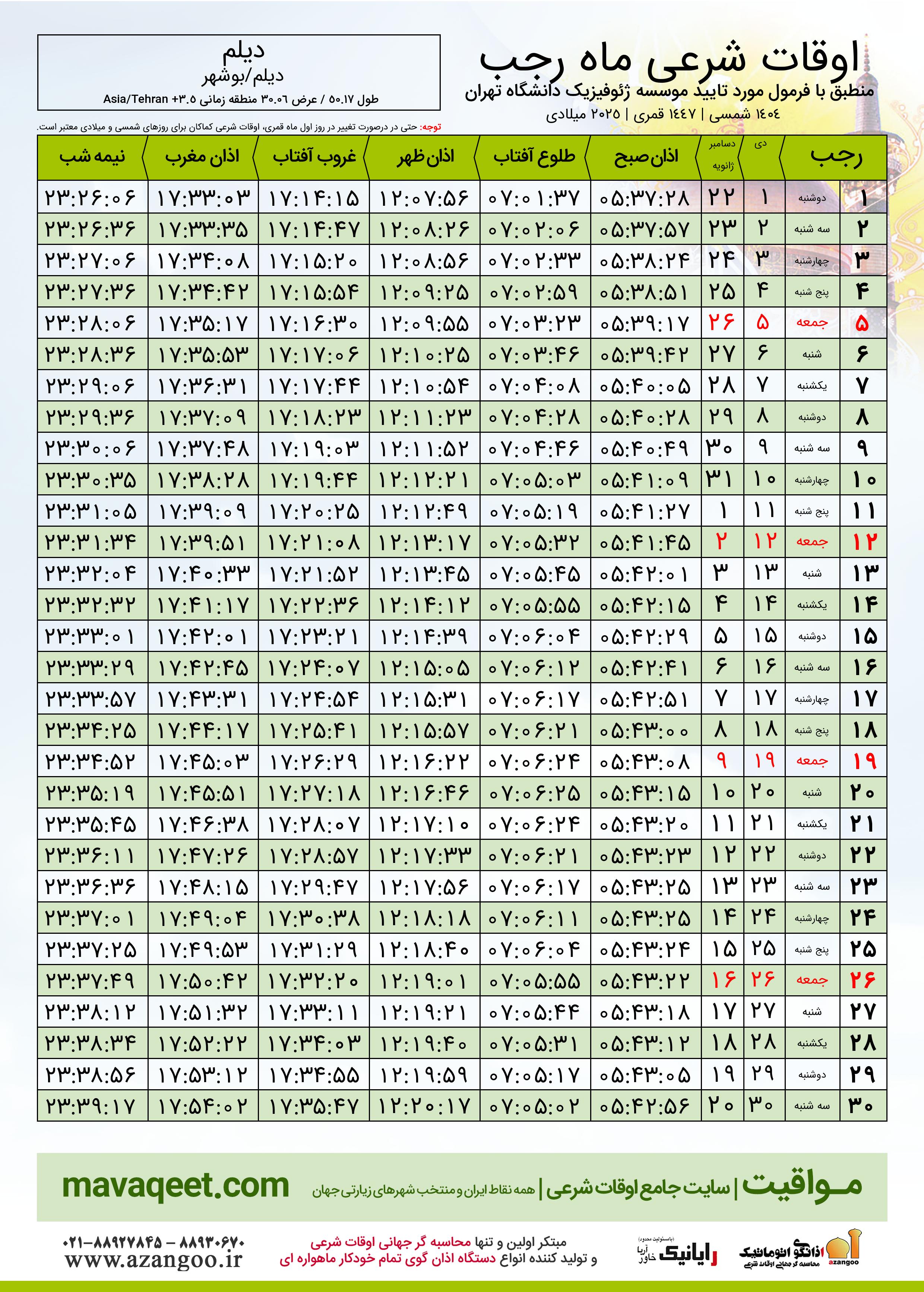 اوقات شرعی ماه رجب ١٤٤٧ هـ.ق شهر دیلم بر