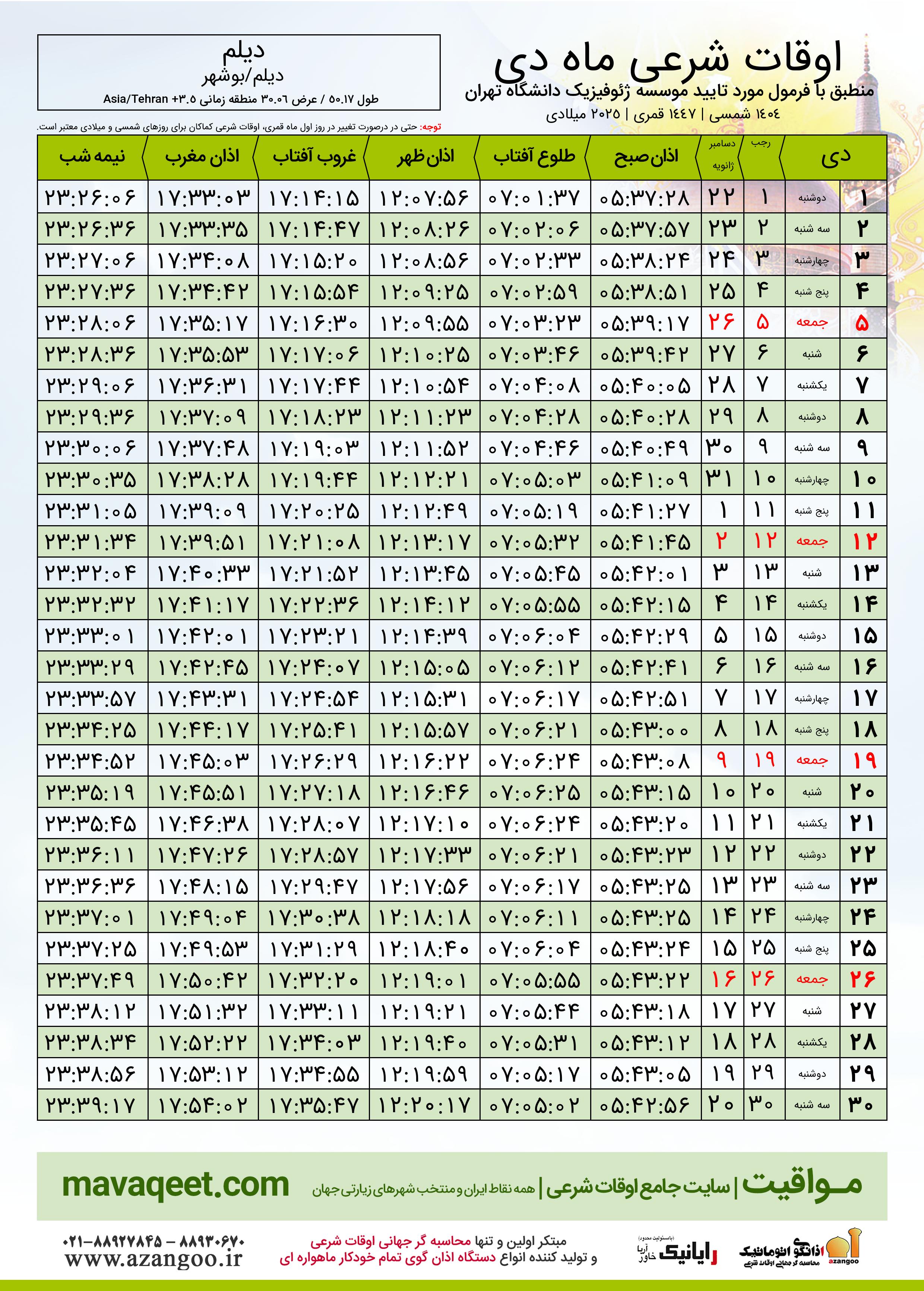جهت نمایش تصویر جدول اوقات شرعی جدول اوقات شرعی دسامبر ٢٠٢٥ میلادی شهر دیلم شهر دیلم در اندازه