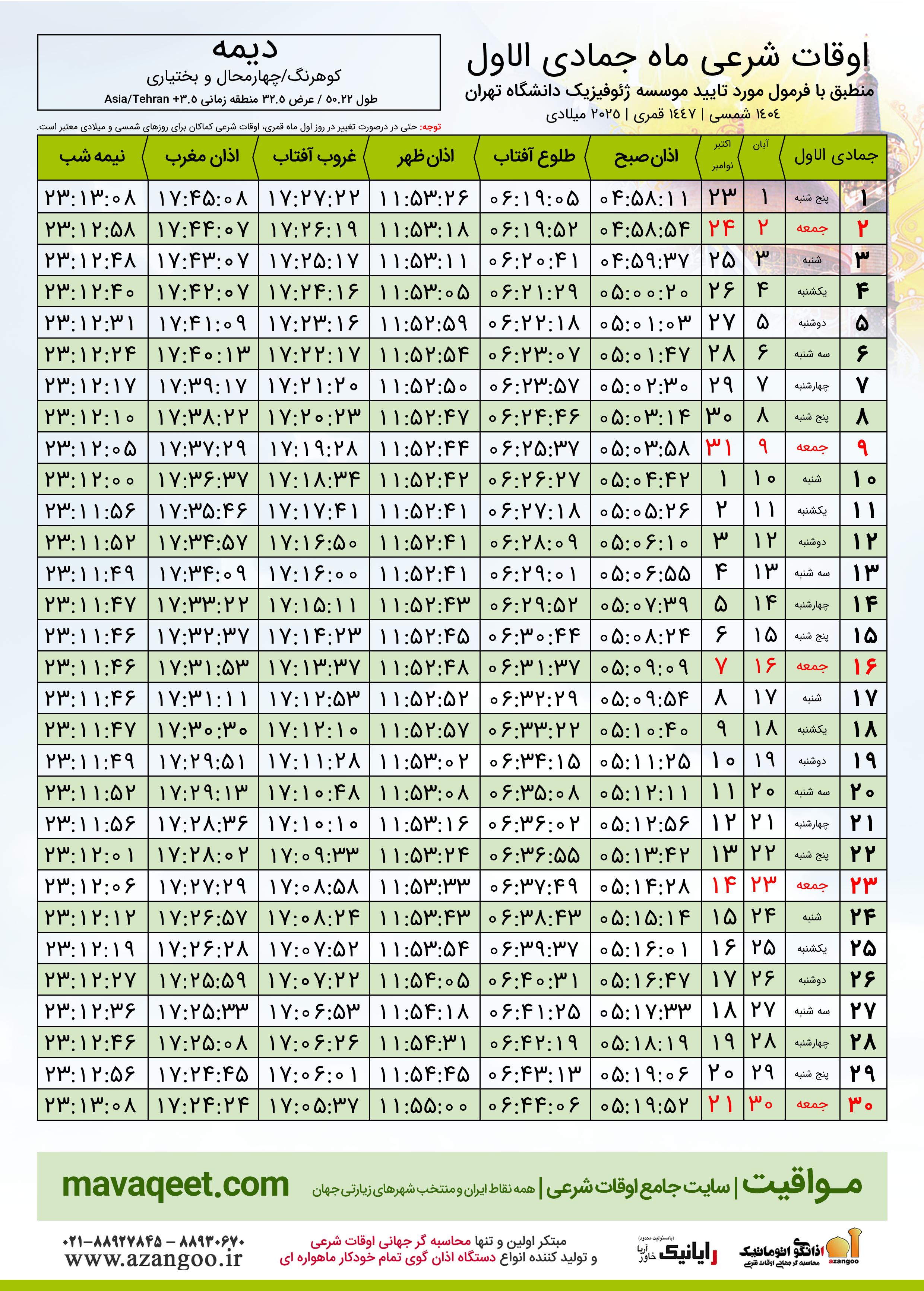 جدول اوقات شرعی جمادی الاول ١٤٤٧ قمری شهر دیمه