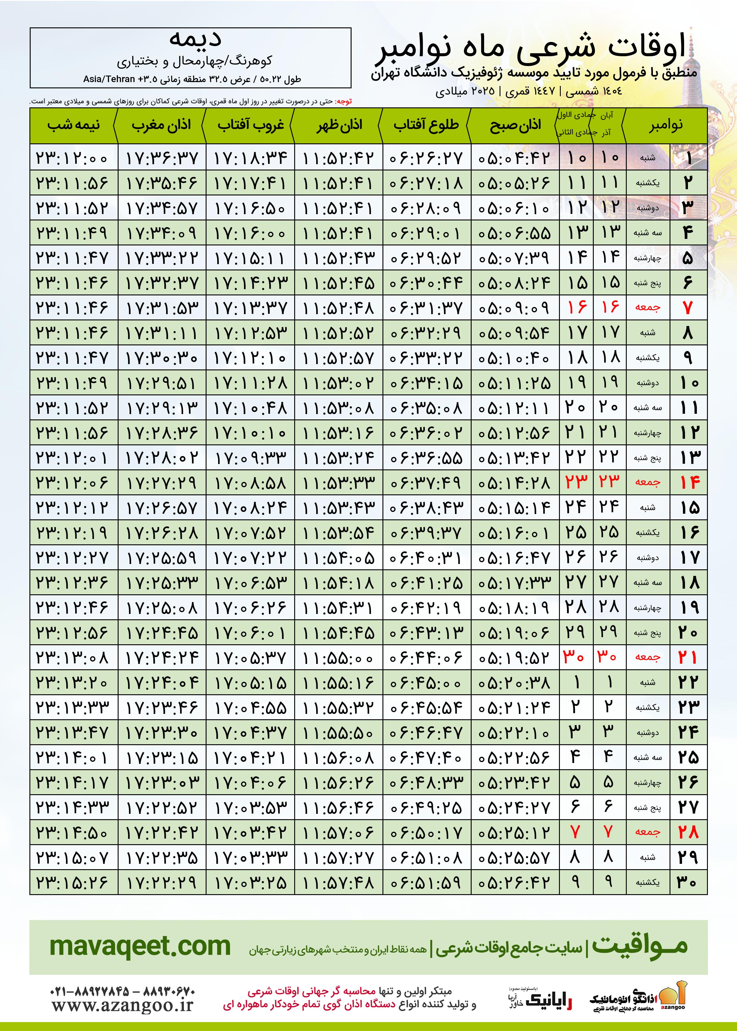 جدول اوقات شرعی آبان ١٤٠٤ شمسی شهر دیمه