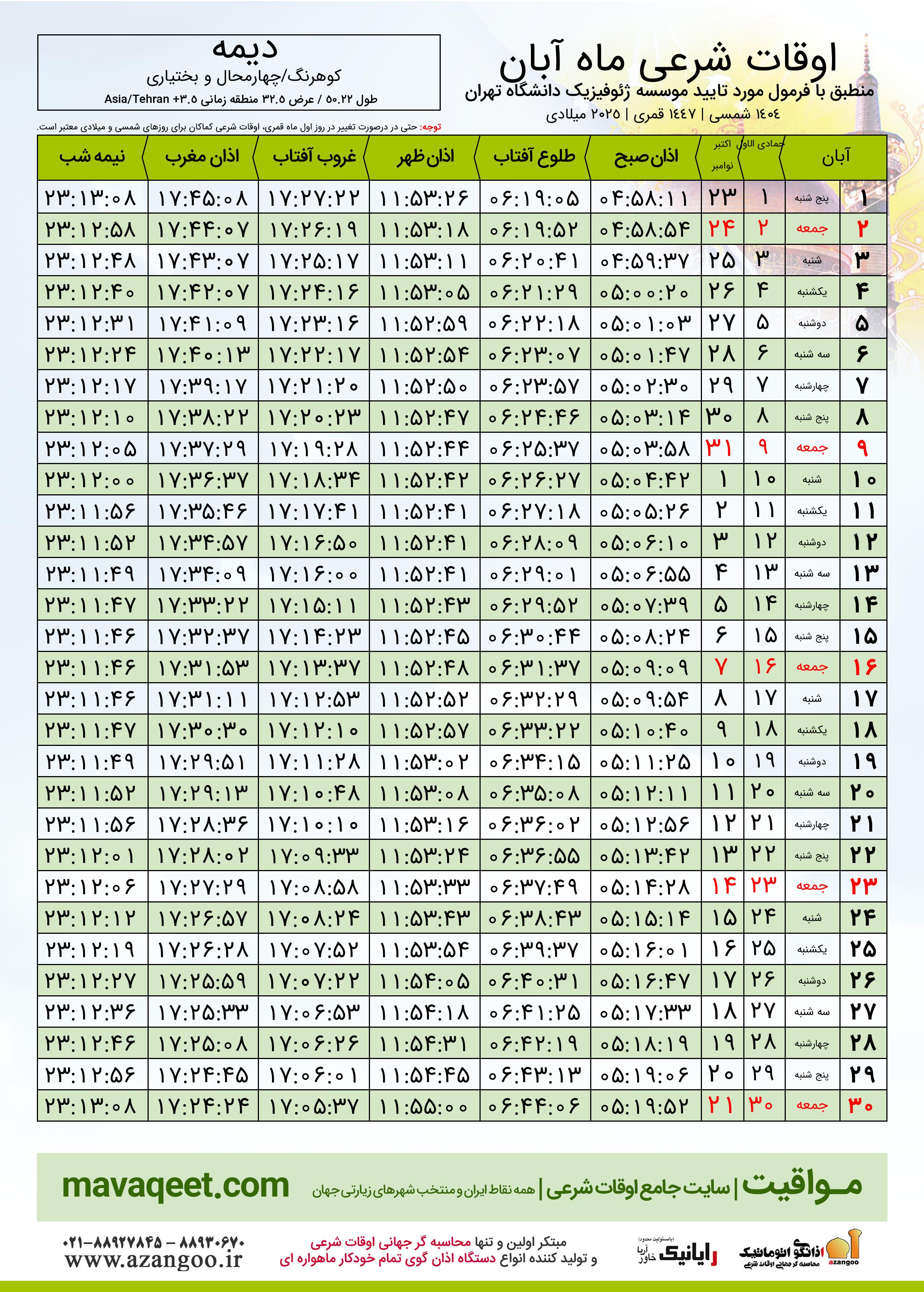 اوقات شرعی آبان ١٤٠٤ شمسی شهر دیمه