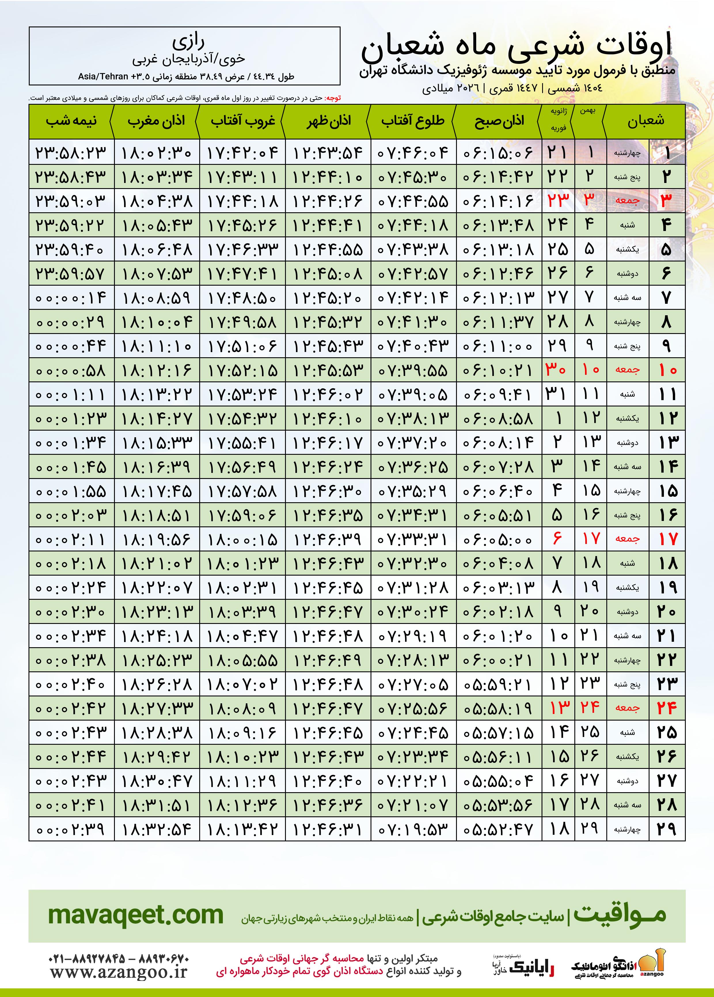 جدول اوقات شرعی شعبان ١٤٤٧ قمری شهر رازی