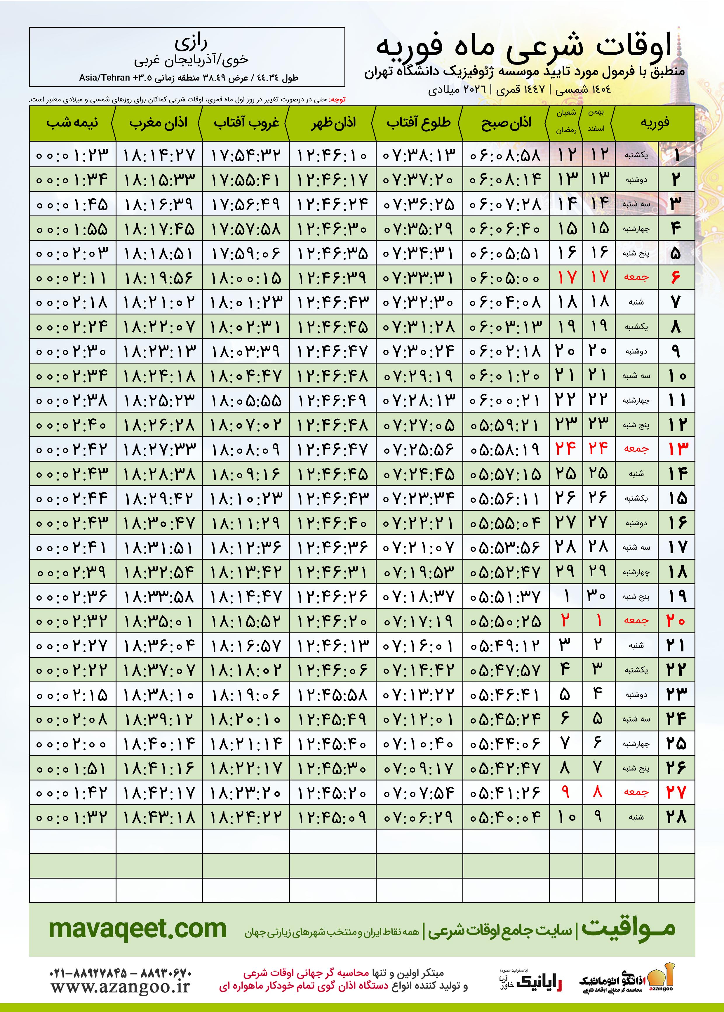 اوقات شرعی فوریه ٢٠٢٦ شهر رازی + دانلود