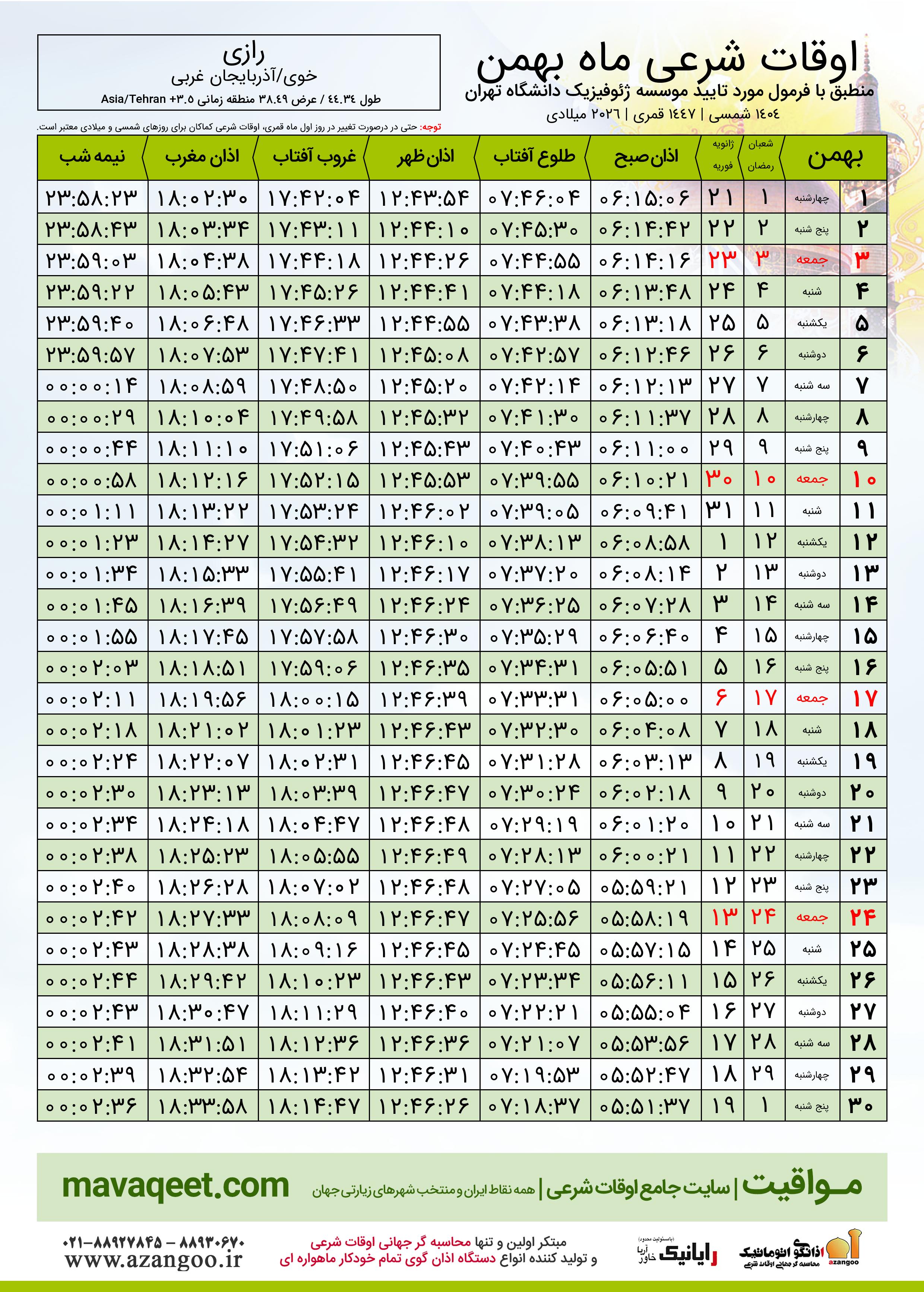 دانلود اوقات شرعی بهمن ٠٤ - ١٤٠٤ شهر رازی