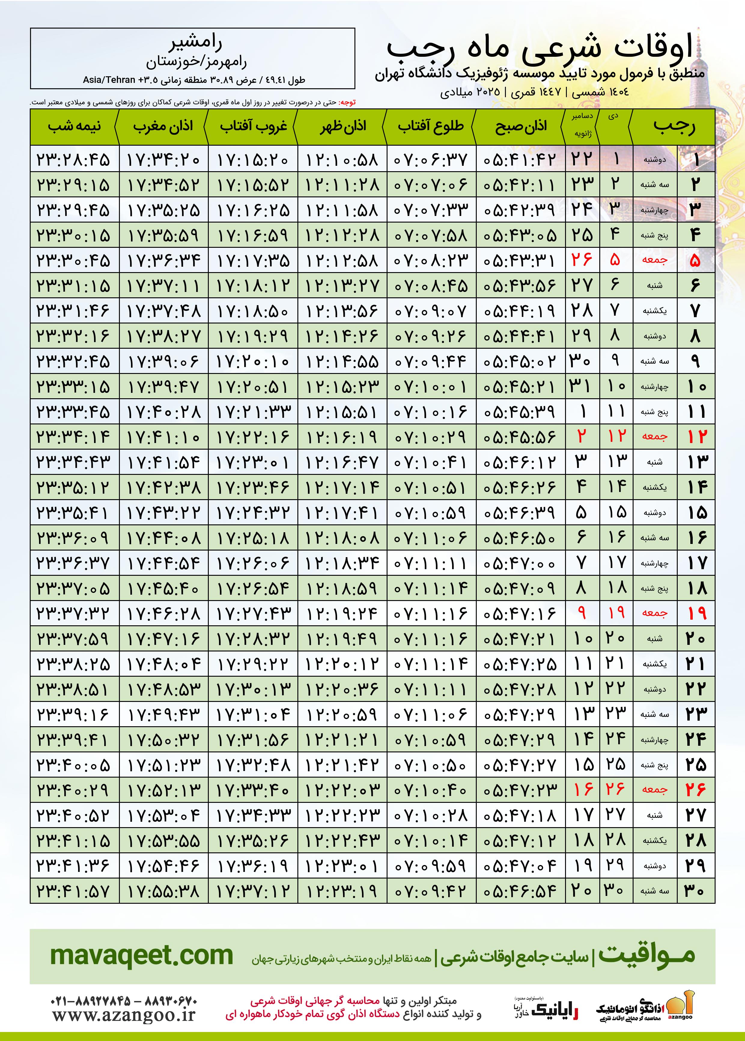 اوقات شرعی ماه رجب ١٤٤٧ هـ.ق شهر رامشیر بر