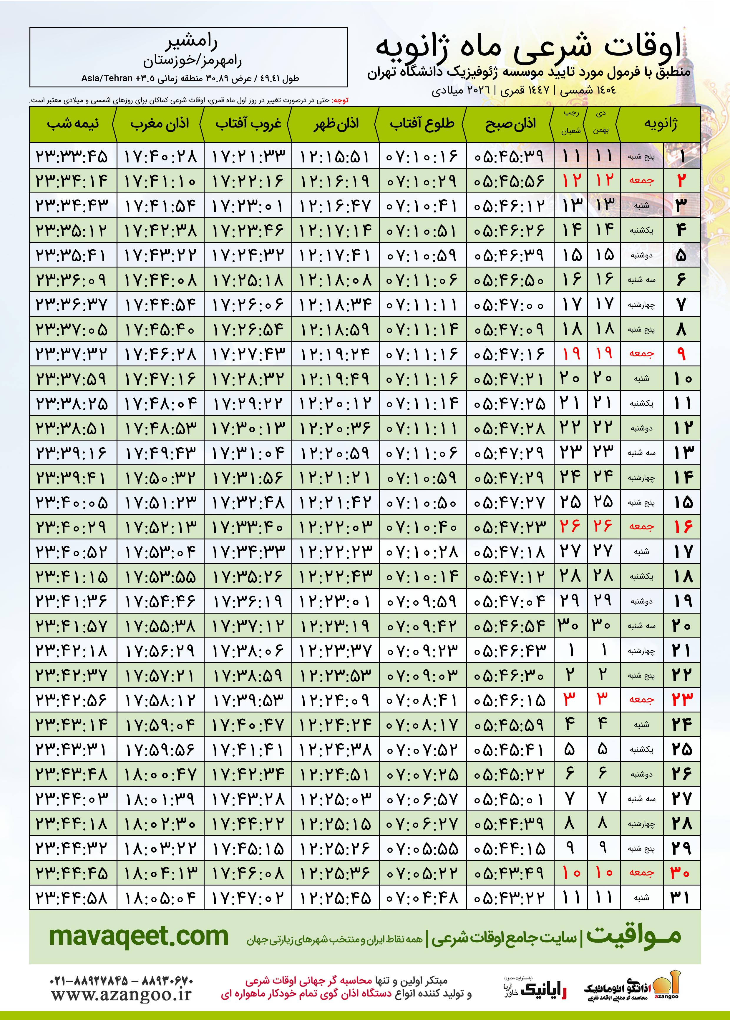 اوقات شرعی ماه رمضان شهر رامشیر ١٤٠٤ - ٠٤ شمسی | ٢٠٢٦ میلادی