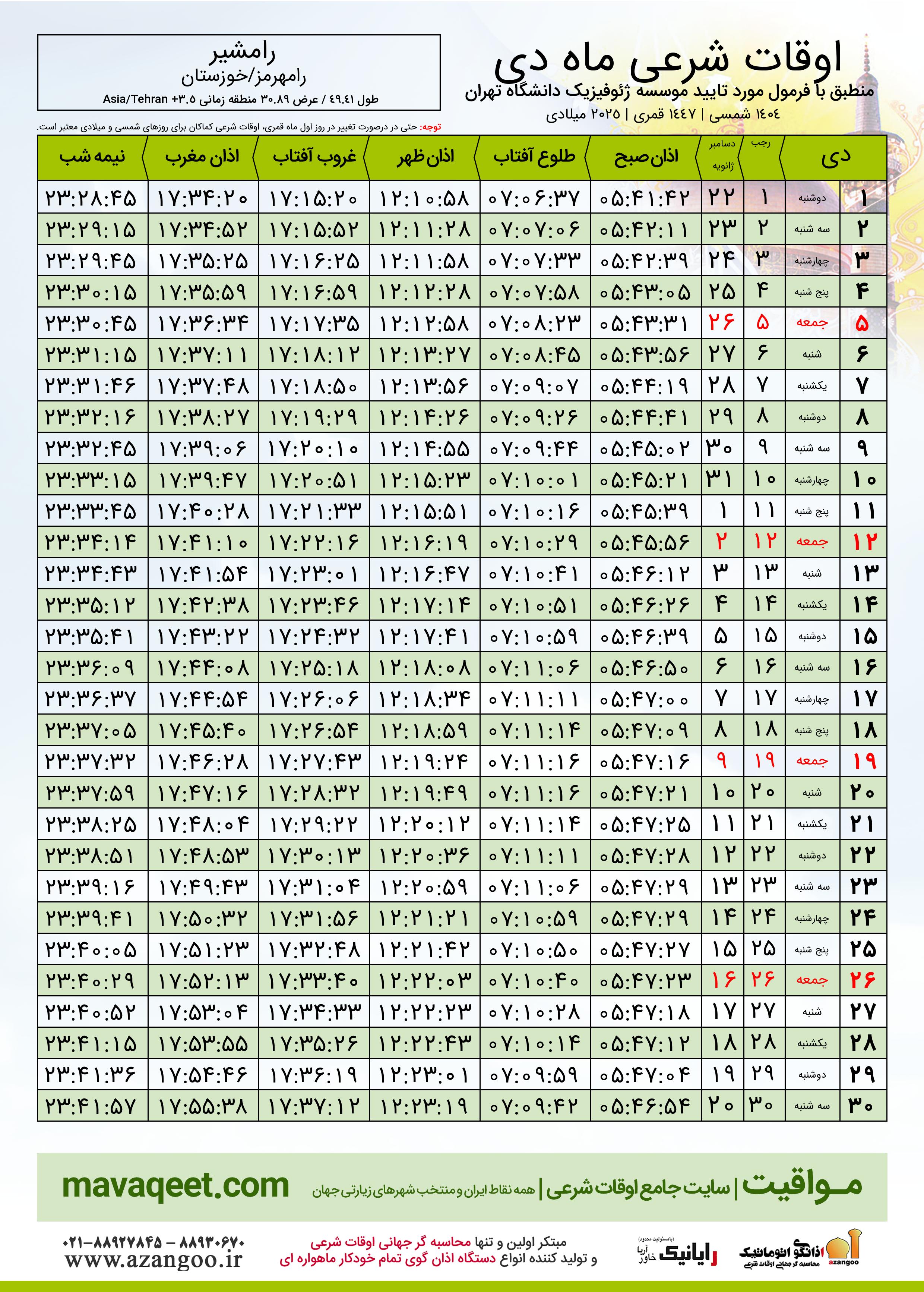 اوقات شرعی دی ١٤٠٤ شمسی شهر رامشیر
