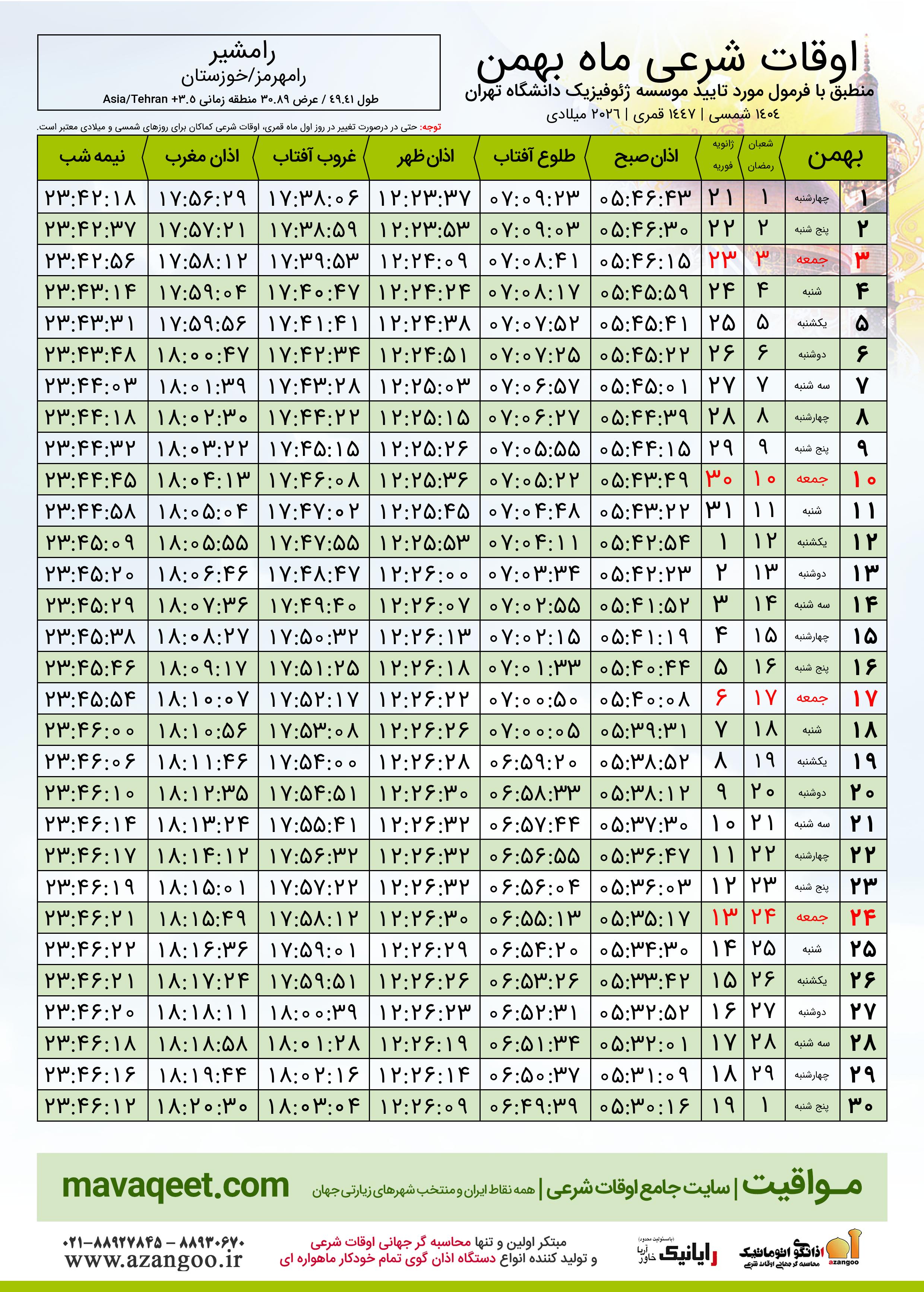 دانلود اوقات شرعی بهمن ٠٤ - ١٤٠٤ شهر رامشیر
