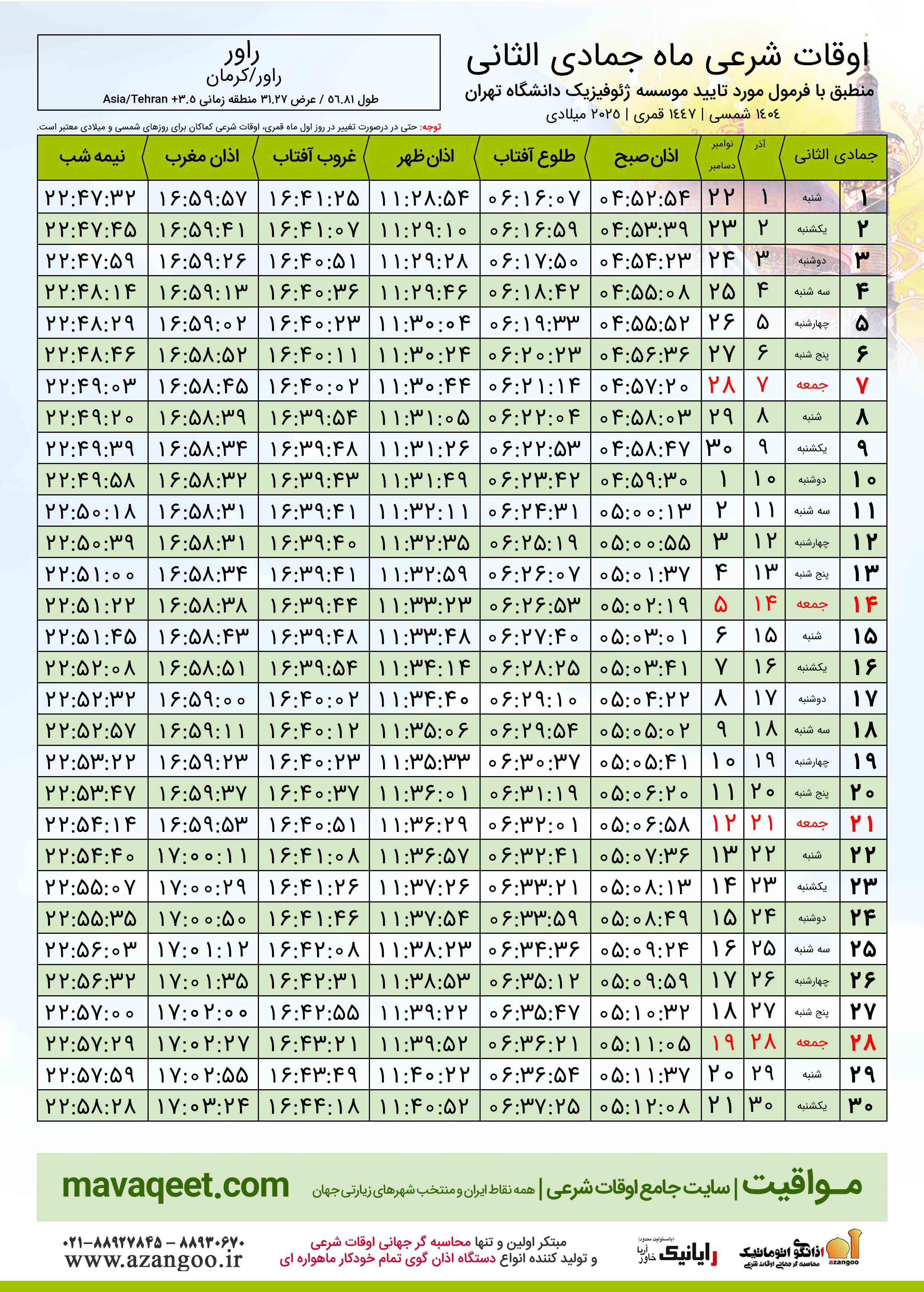 اوقات شرعی ماه جمادی الثانی ١٤٤٧ هـ.ق شهر راور بر