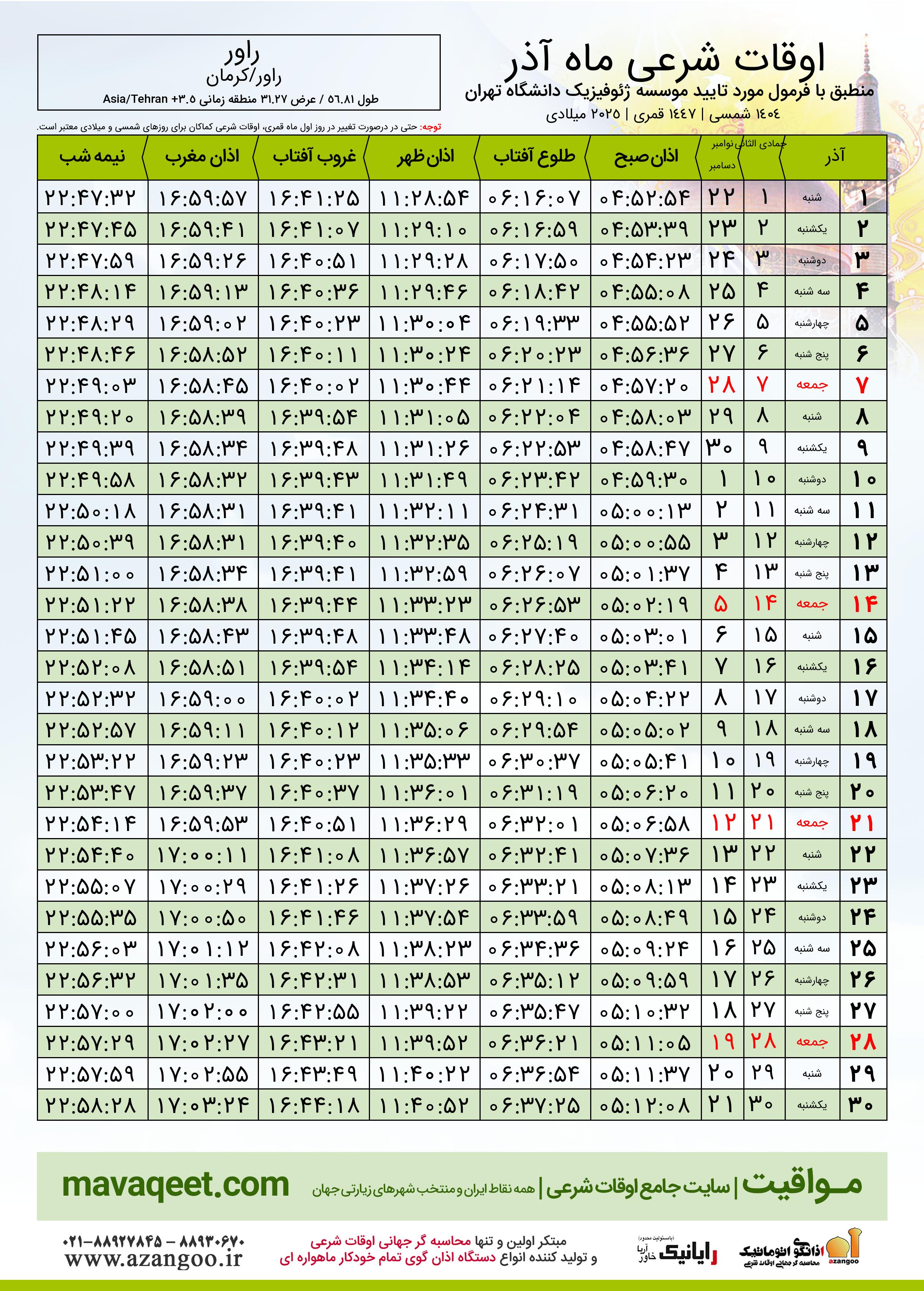 جدول اوقات شرعی آذر ١٤٠٤ شمسی شهر راور