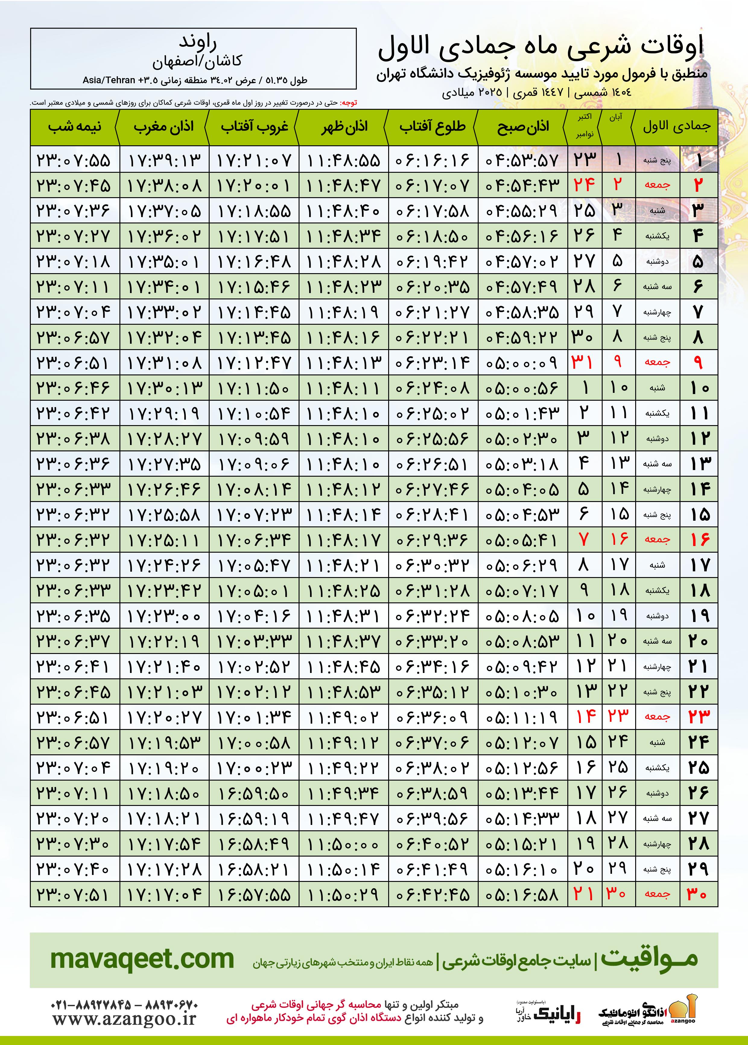 جدول اوقات شرعی جمادی الاول ١٤٤٧ قمری شهر راوند