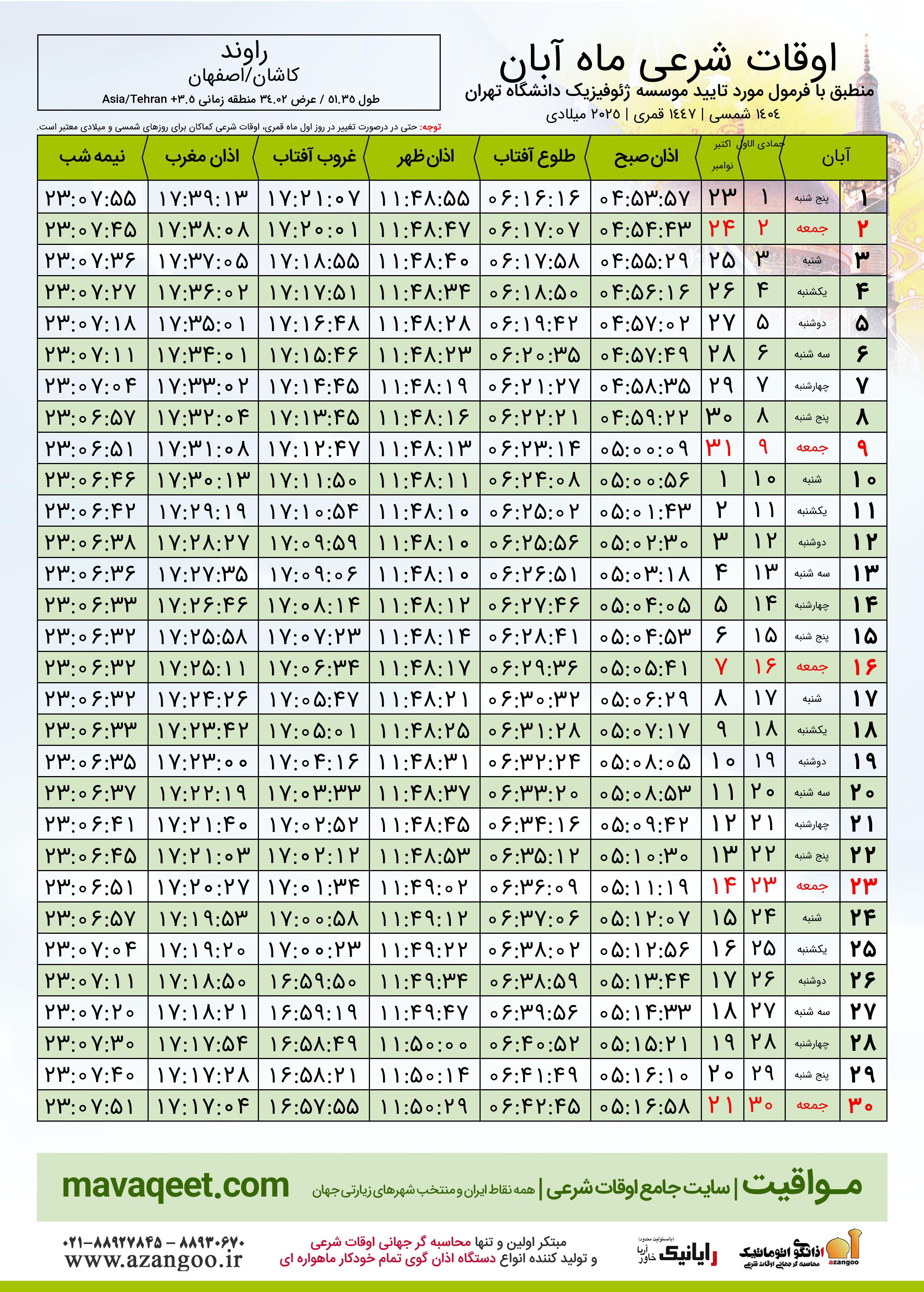 جدول اوقات شرعی آبان ١٤٠٤ شمسی شهر راوند