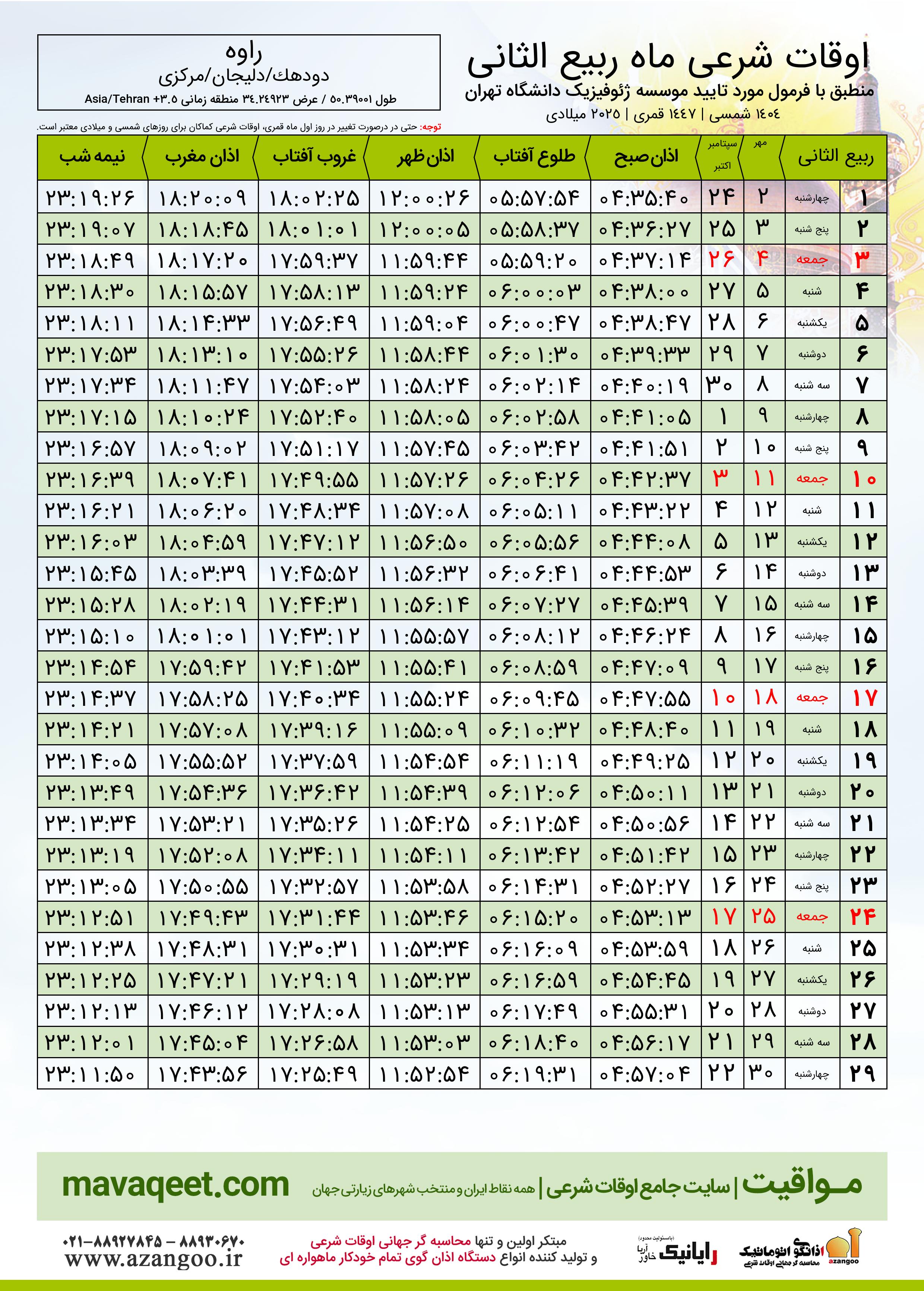 جدول اوقات شرعی ربیع الثانی ١٤٤٧ قمری روستای راوه