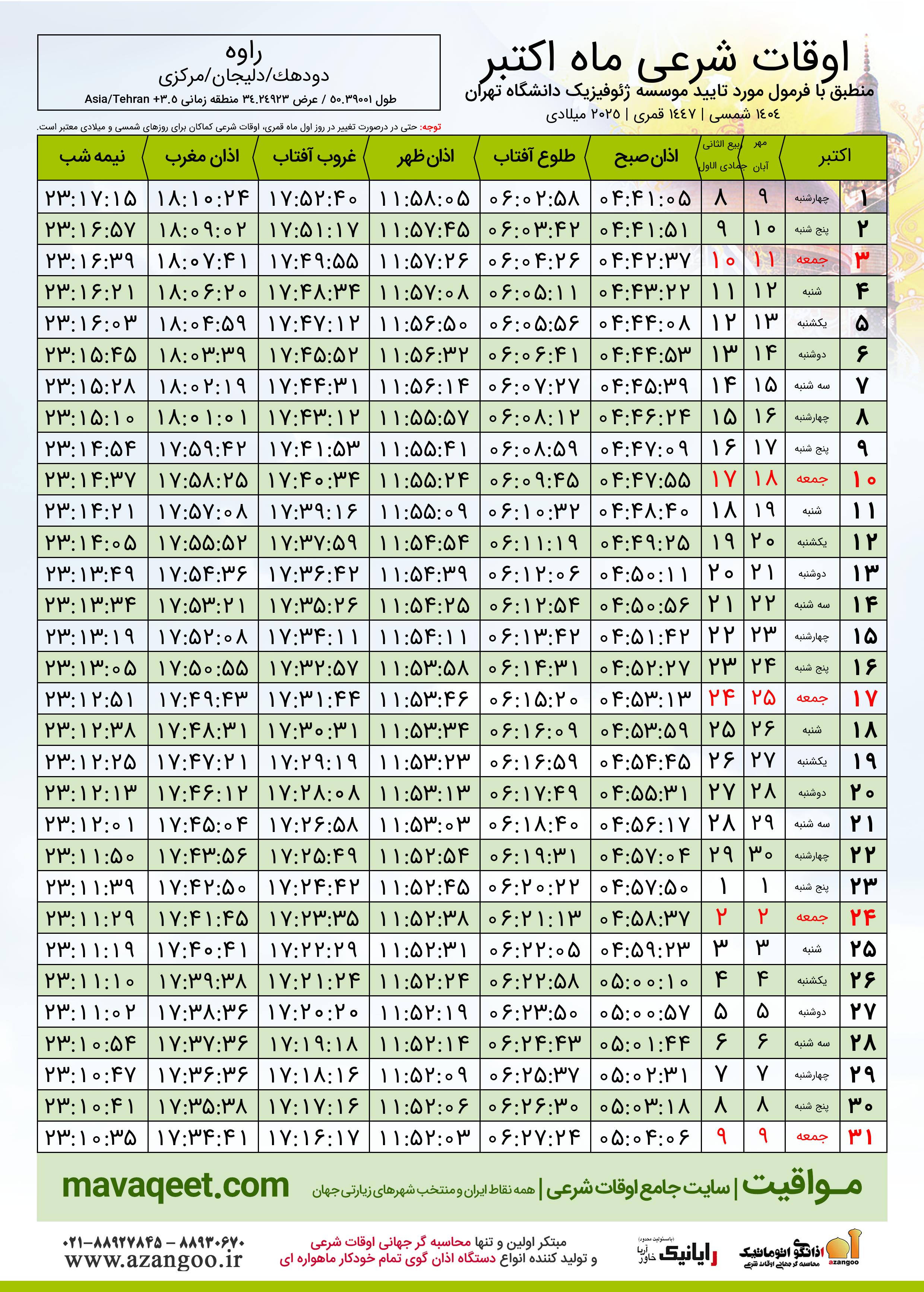 جهت نمایش تصویر جدول اوقات شرعی جدول اوقات شرعی اکتبر ٢٠٢٥ میلادی روستای راوه روستای راوه در اندازه