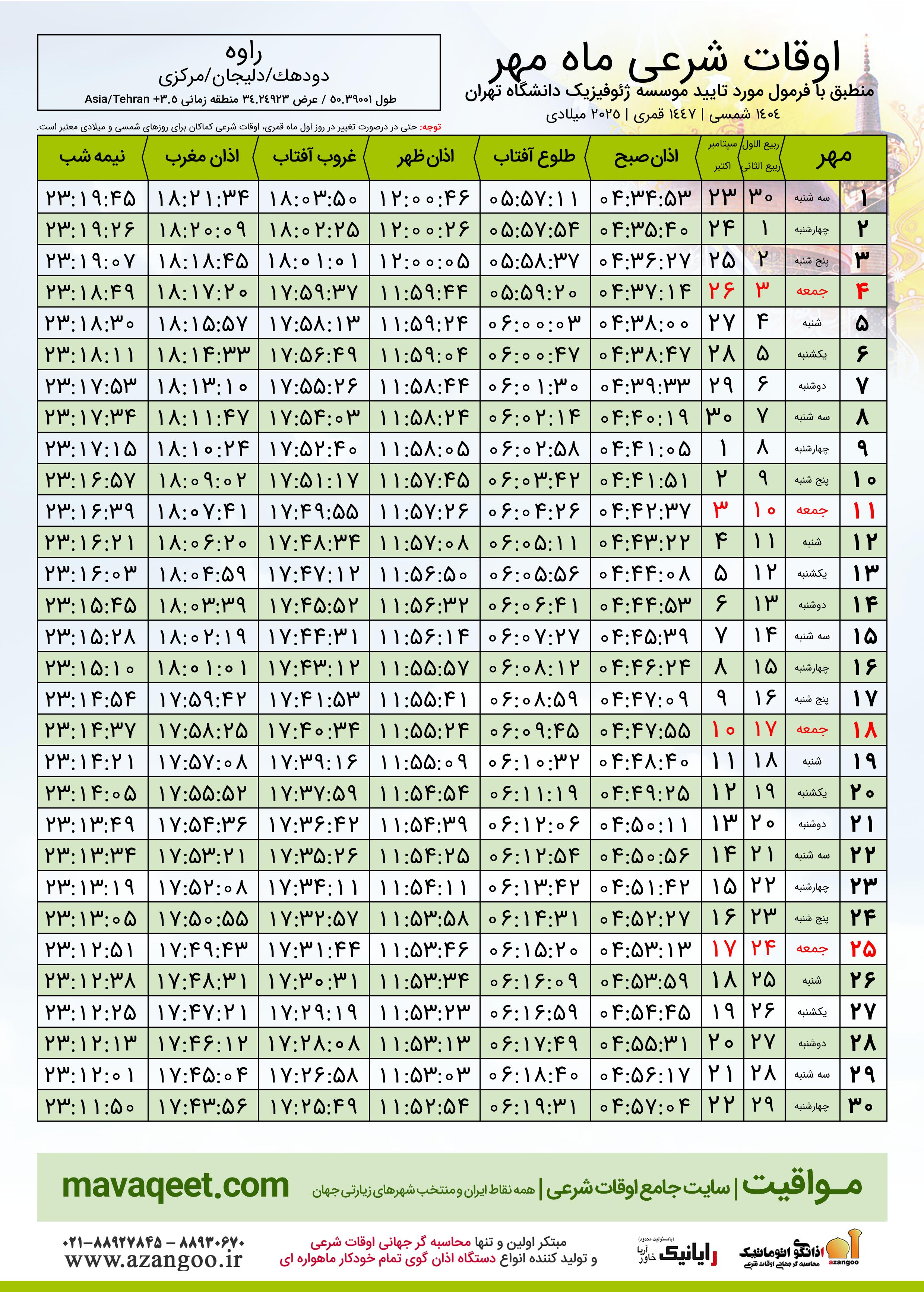 جدول اوقات شرعی مهر ١٤٠٤ شمسی روستای راوه