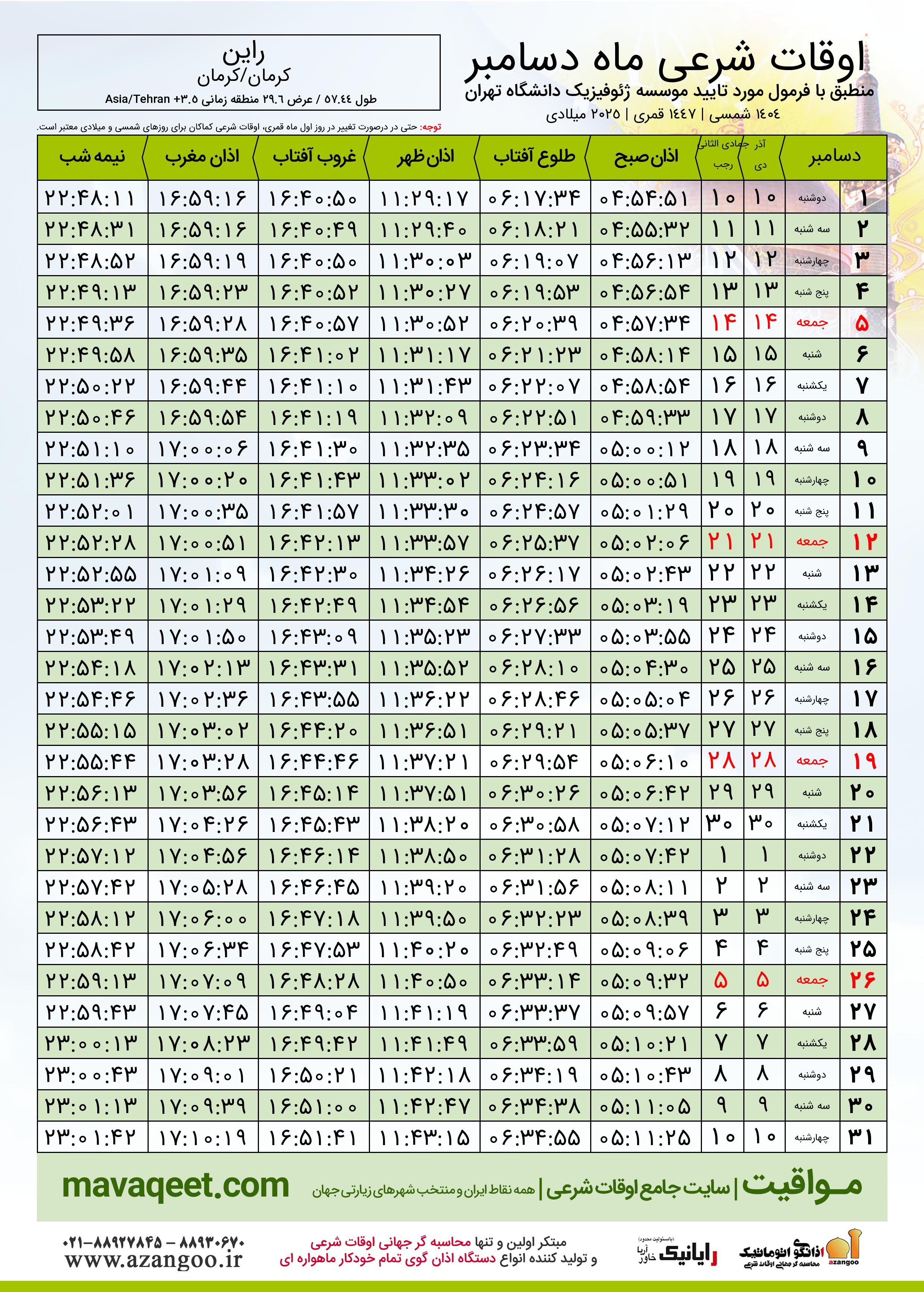 جدول اوقات شرعی دسامبر ٢٠٢٥ میلادی شهر راین