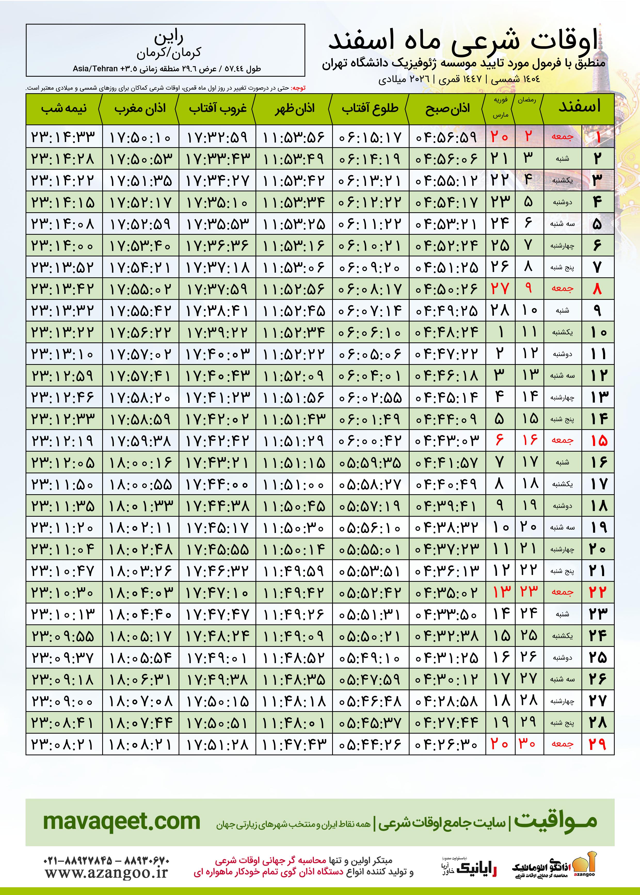 اوقات شرعی ماه رمضان شهر راین ١٤٠٤ - ٠٤ شمسی | ٢٠٢٦ میلادی