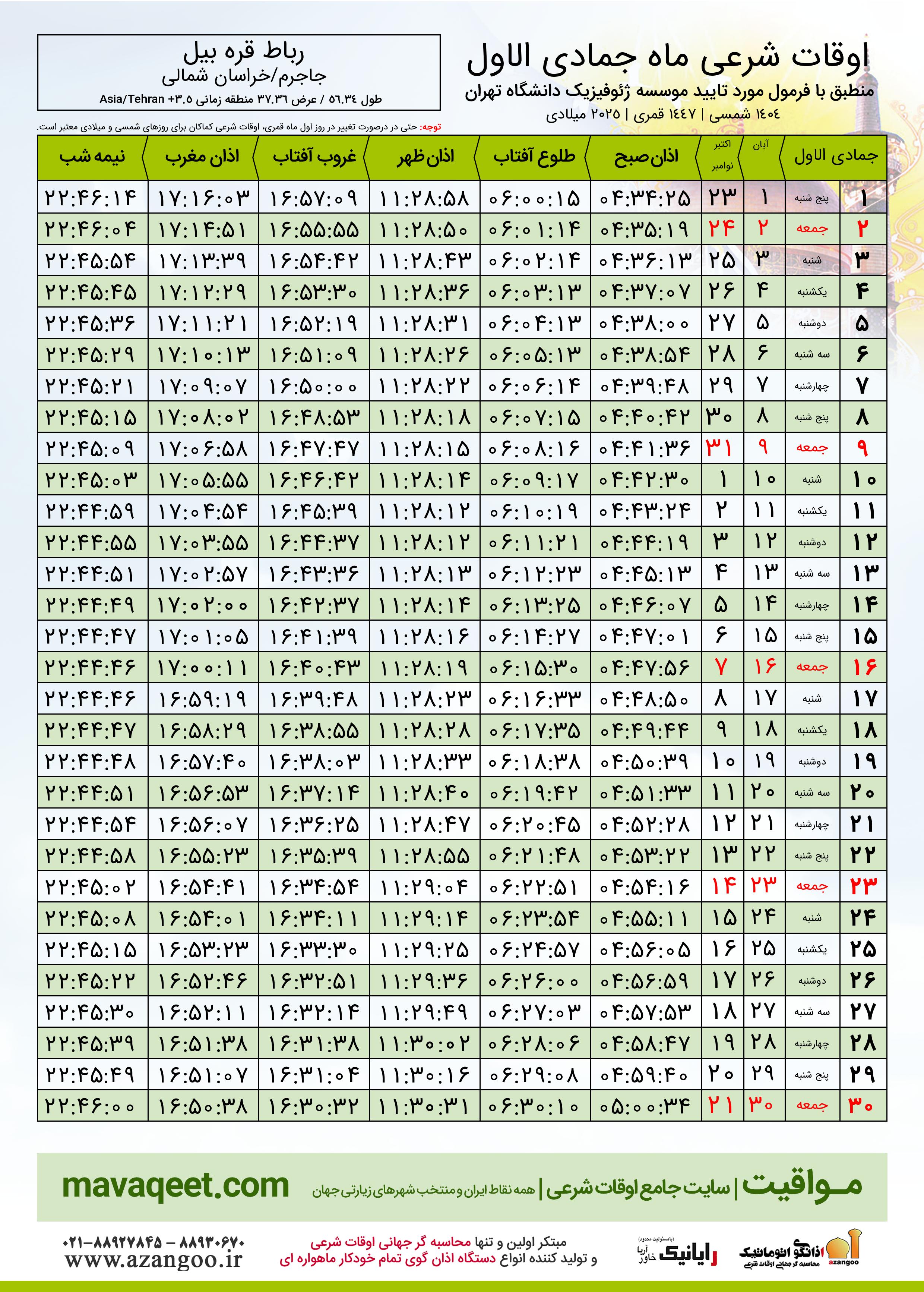 اوقات شرعی ماه جمادی الاول ١٤٤٧ هـ.ق شهر رباط قره بیل بر