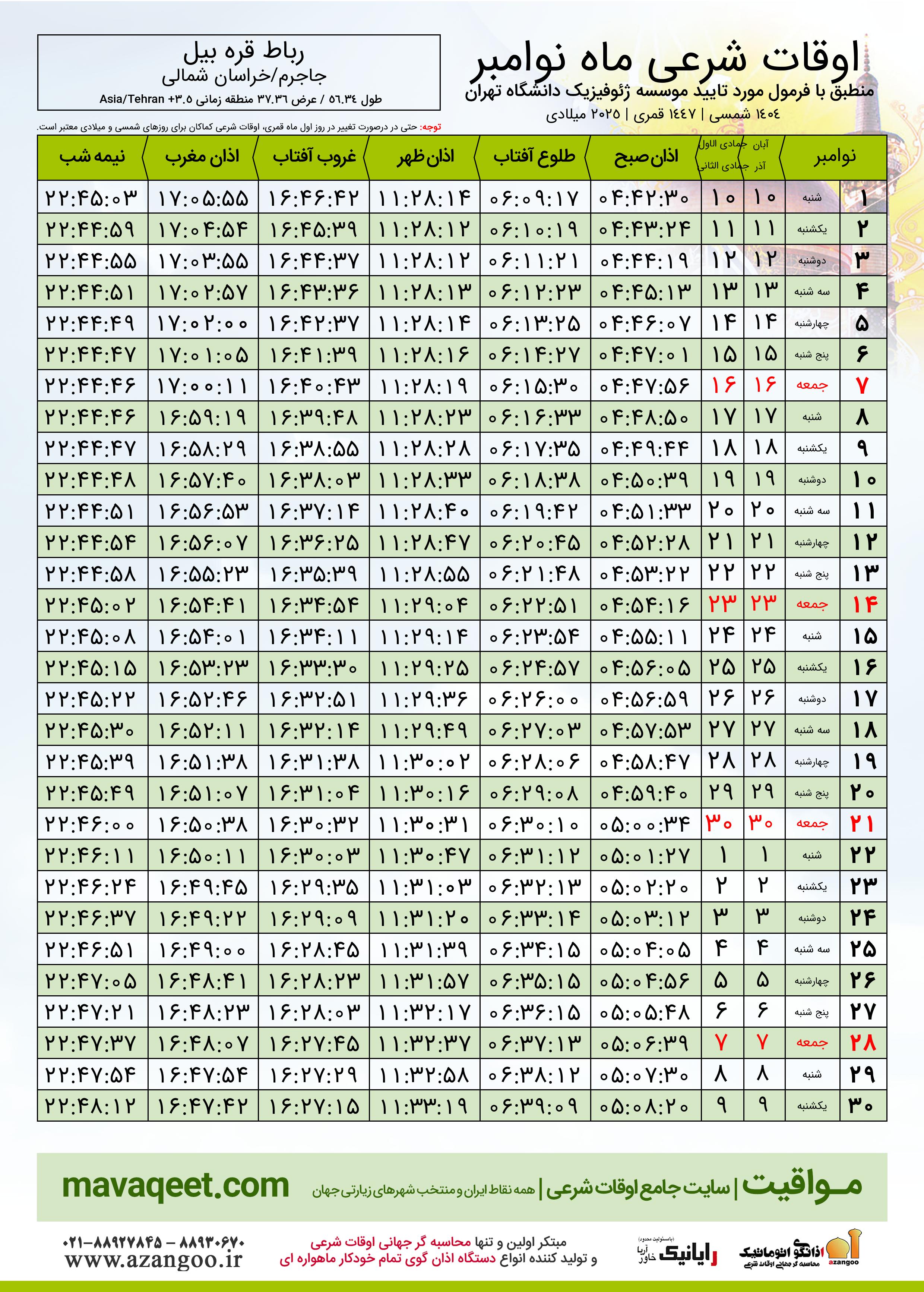 جهت نمایش تصویر جدول اوقات شرعی جدول اوقات شرعی نوامبر ٢٠٢٥ میلادی شهر رباط قره بیل شهر رباط قره بیل در اندازه