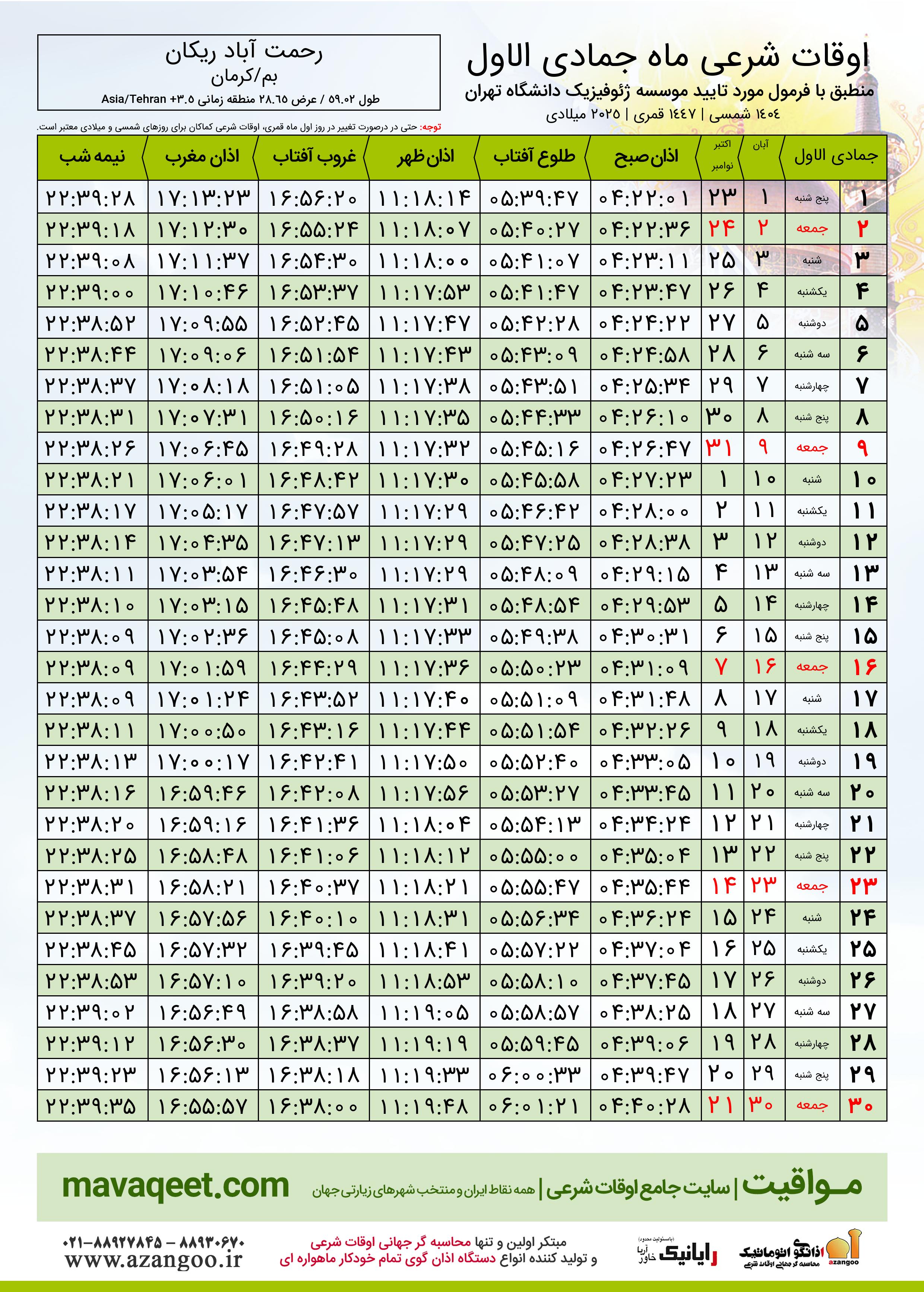 جدول اوقات شرعی جمادی الاول ١٤٤٧ قمری شهر رحمت آباد ریکان