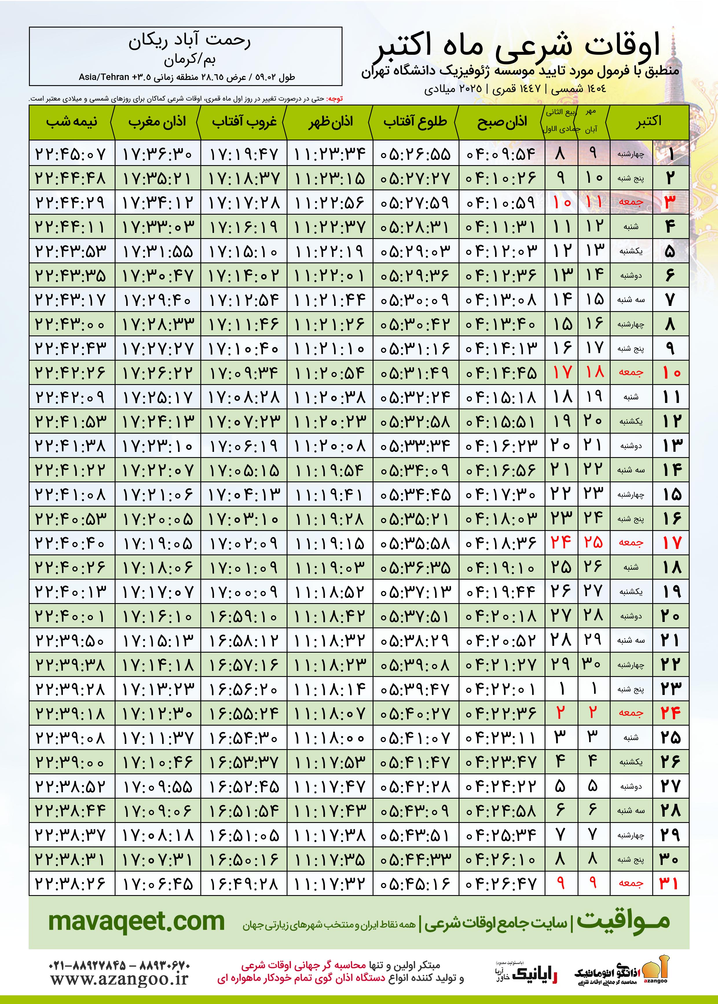 اوقات شرعی اکتبر ٢٠٢٥ میلادی شهر رحمت آباد ریکان