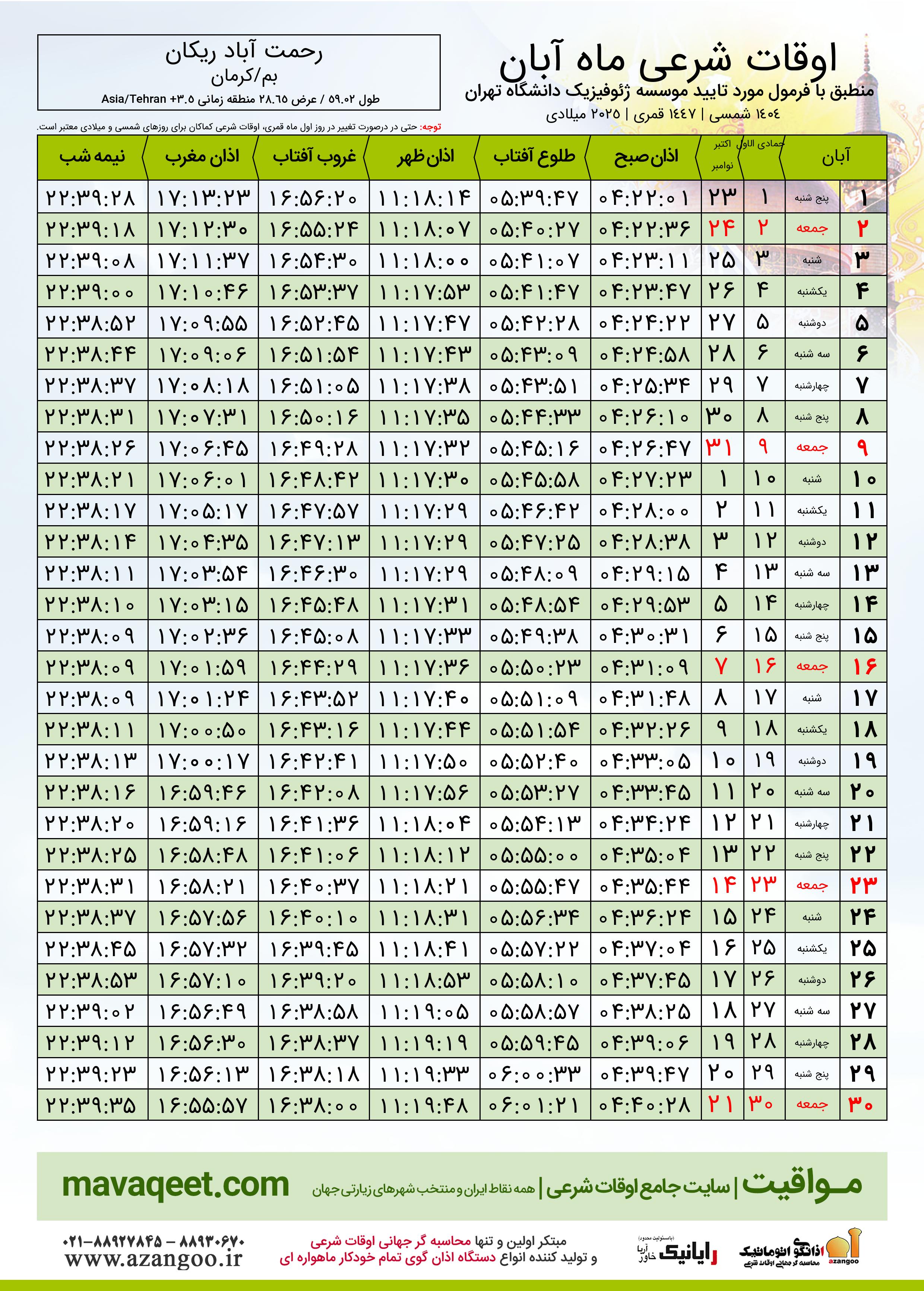 جدول اوقات شرعی آبان ١٤٠٤ شمسی شهر رحمت آباد ریکان