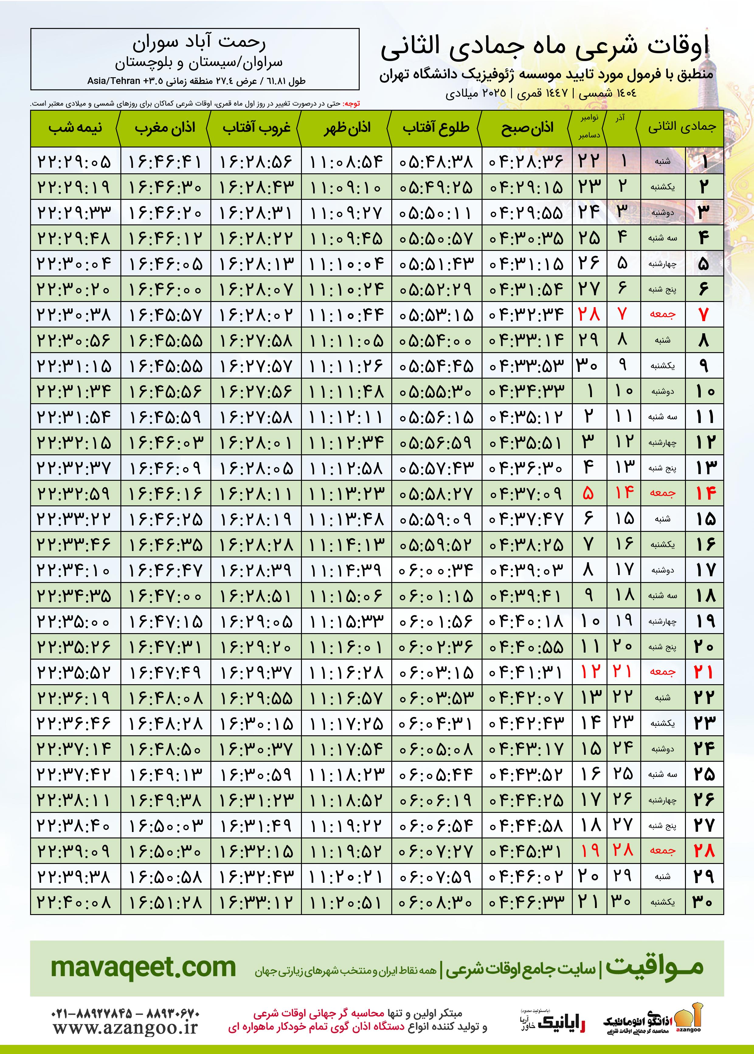 جدول اوقات شرعی جمادی الثانی ١٤٤٧ قمری شهر رحمت آباد سوران
