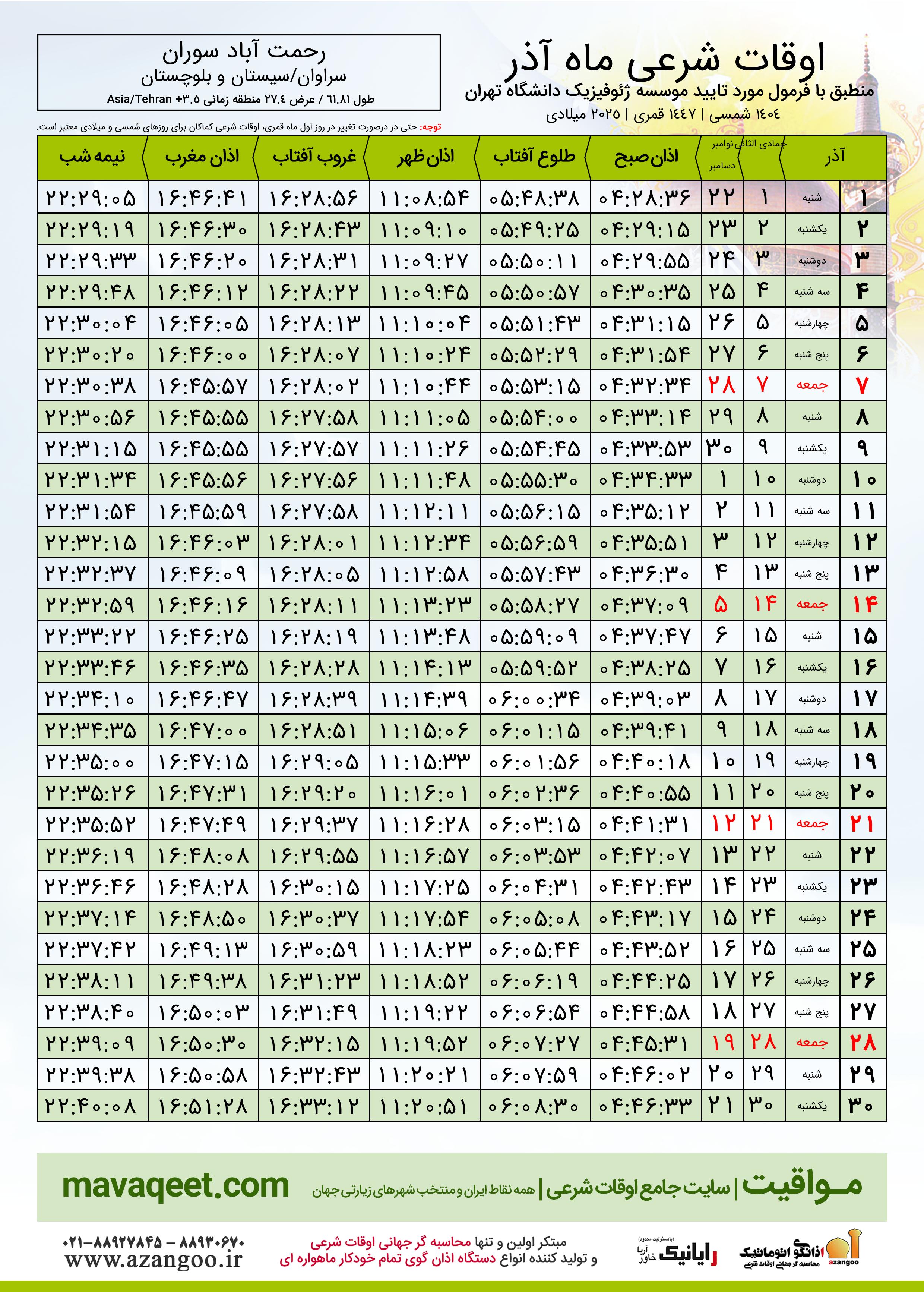 جدول اوقات شرعی آذر ١٤٠٤ شمسی شهر رحمت آباد سوران