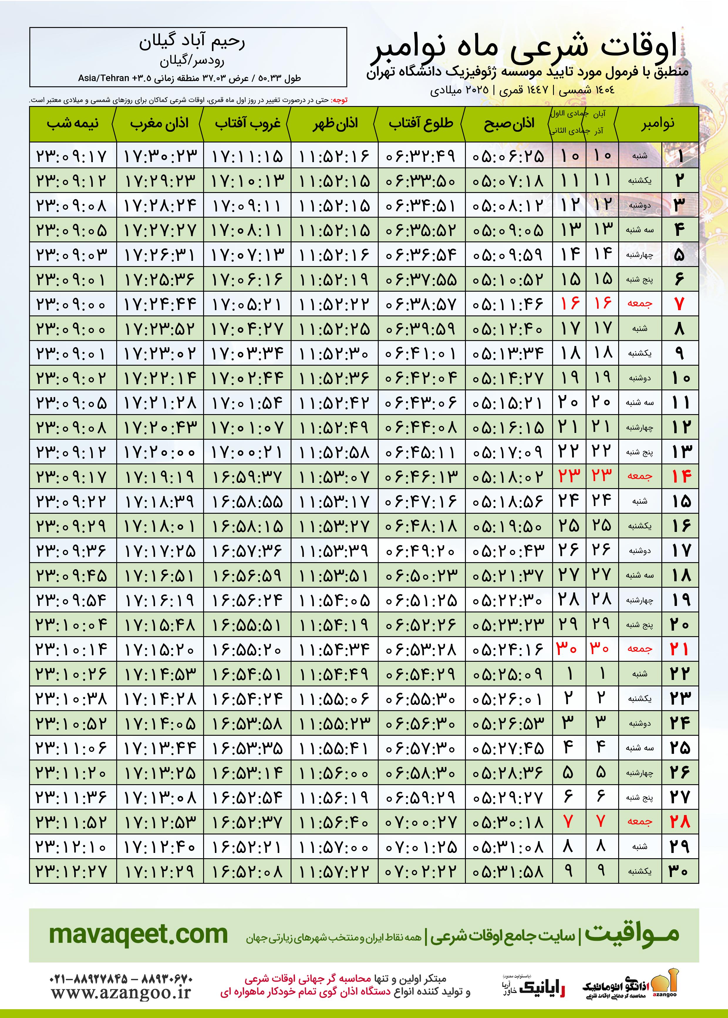 اوقات شرعی نوامبر ٢٠٢٥ میلادی شهر رحیم آباد گیلان