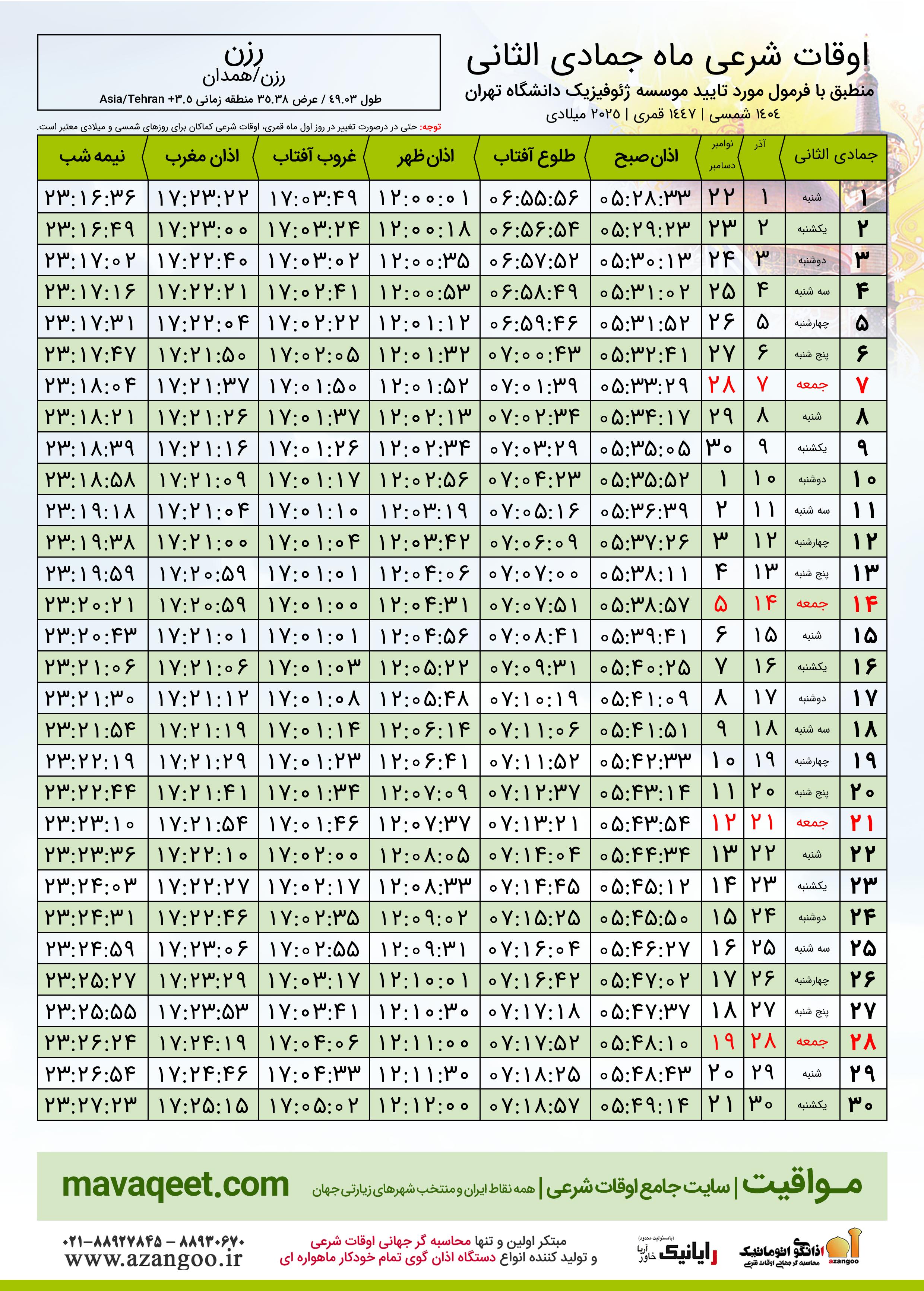 اوقات شرعی ماه جمادی الثانی ١٤٤٧ هـ.ق شهر رزن بر